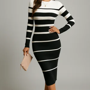Robe pull rayée hiver femme col rond mi-longue ajustée