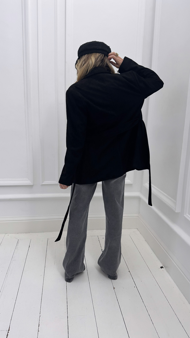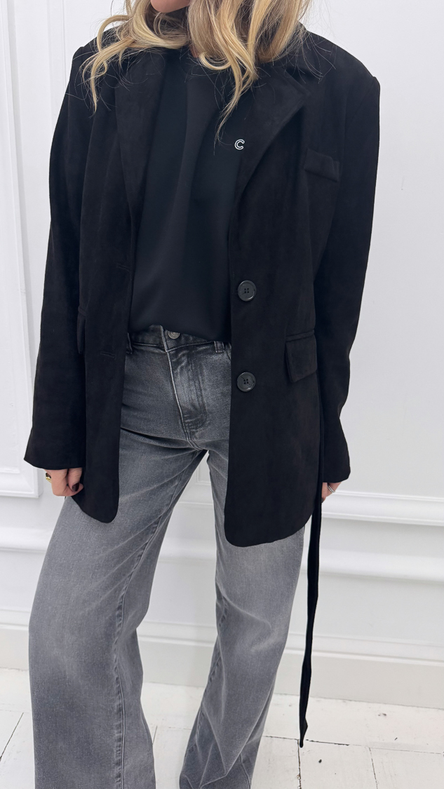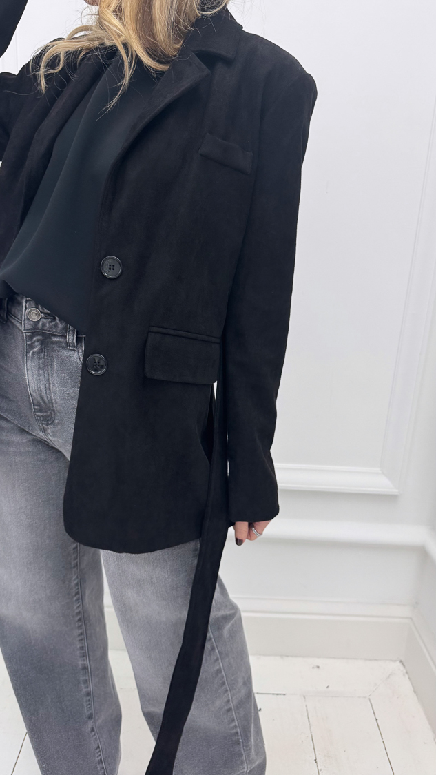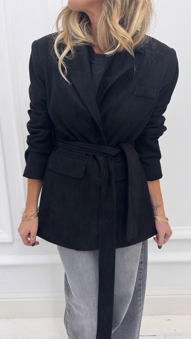 Le blazer noir en daim, ses épaulettes et ses poches droites à rabats et sa ceinture épaisse pour marquer votre taille!