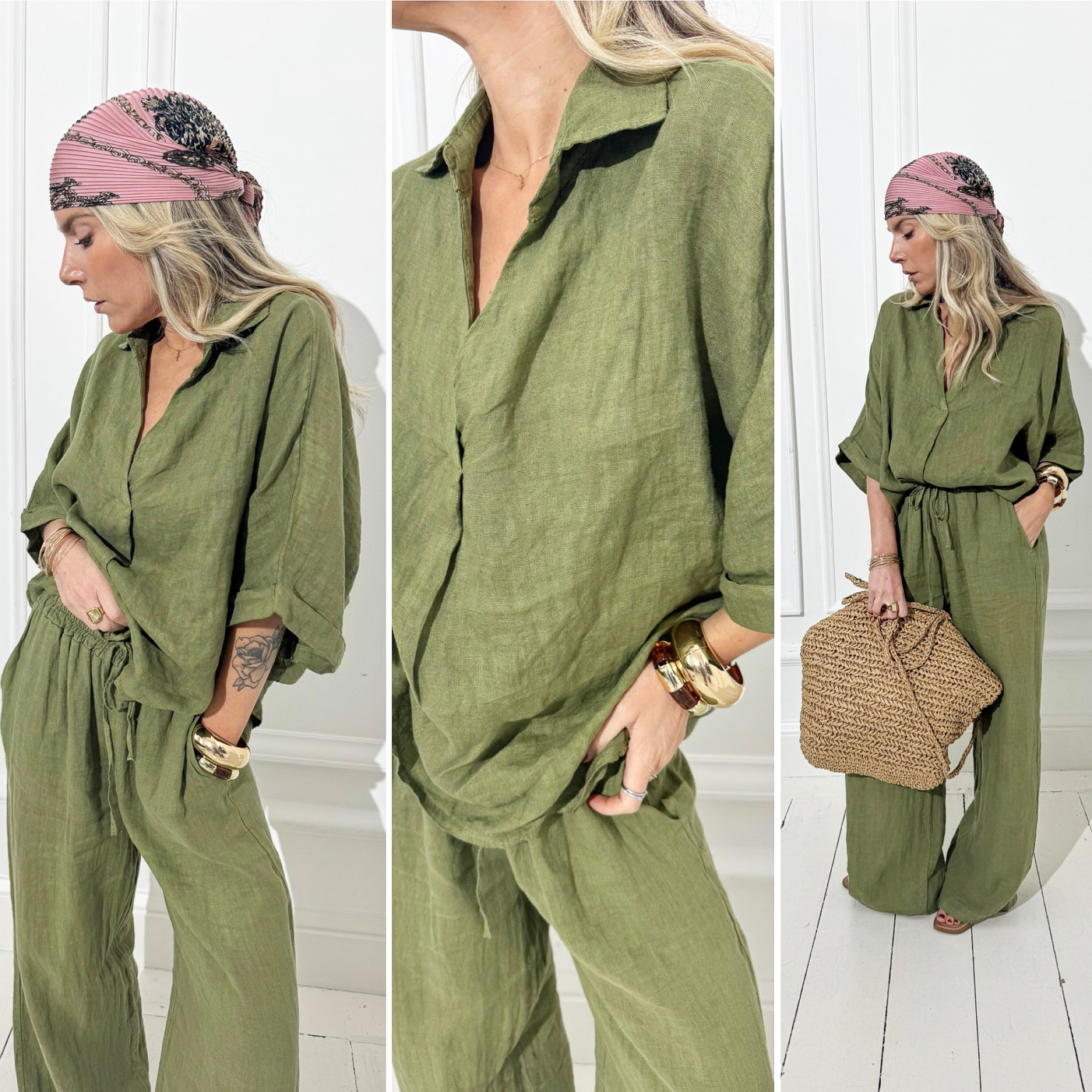 La blouse kaki en lin, col v, à associer au pantalon kaki en lin pour un total look !