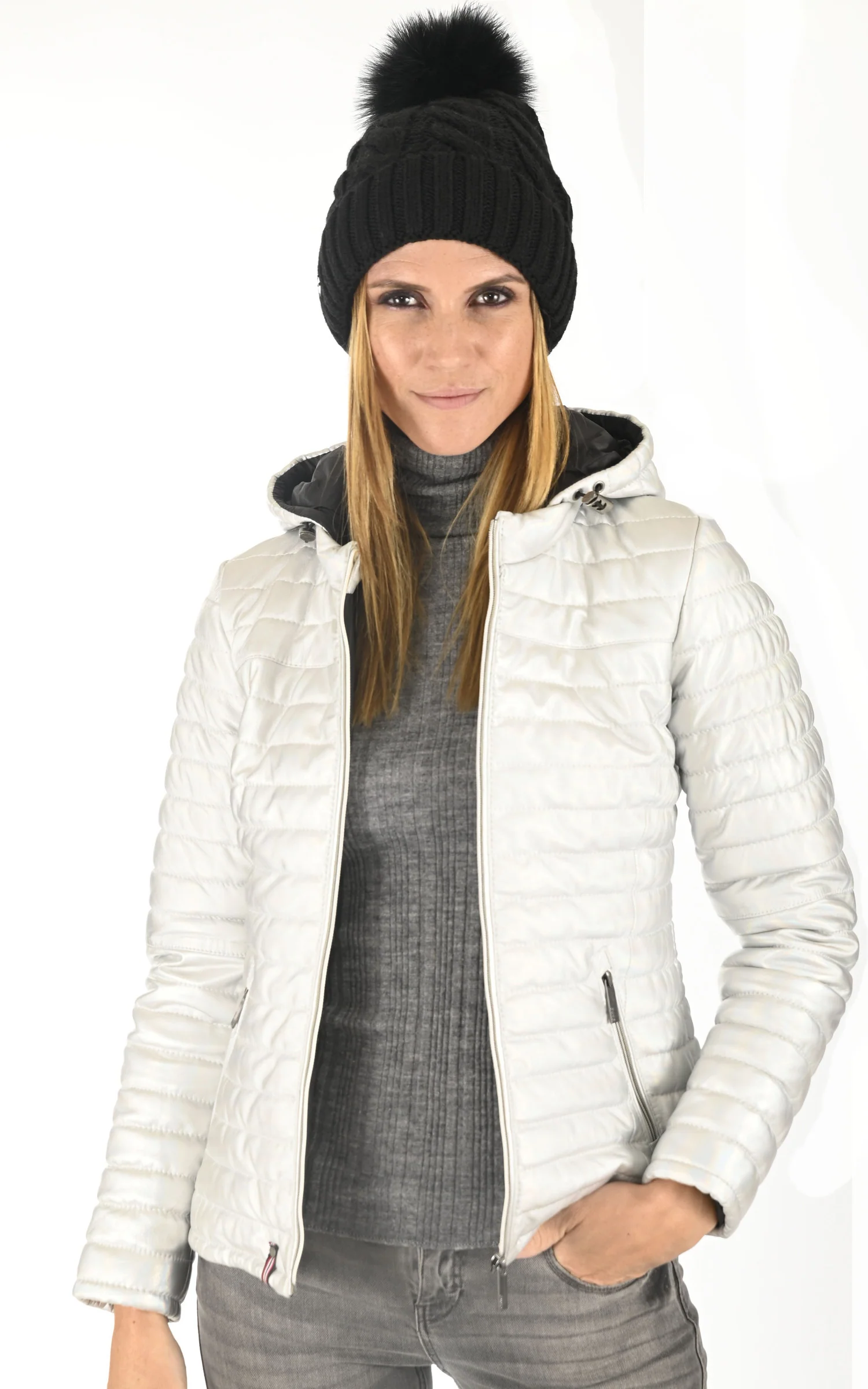 – Pompon amovible par bouton pression– Pompon en plumes de dindes teintes