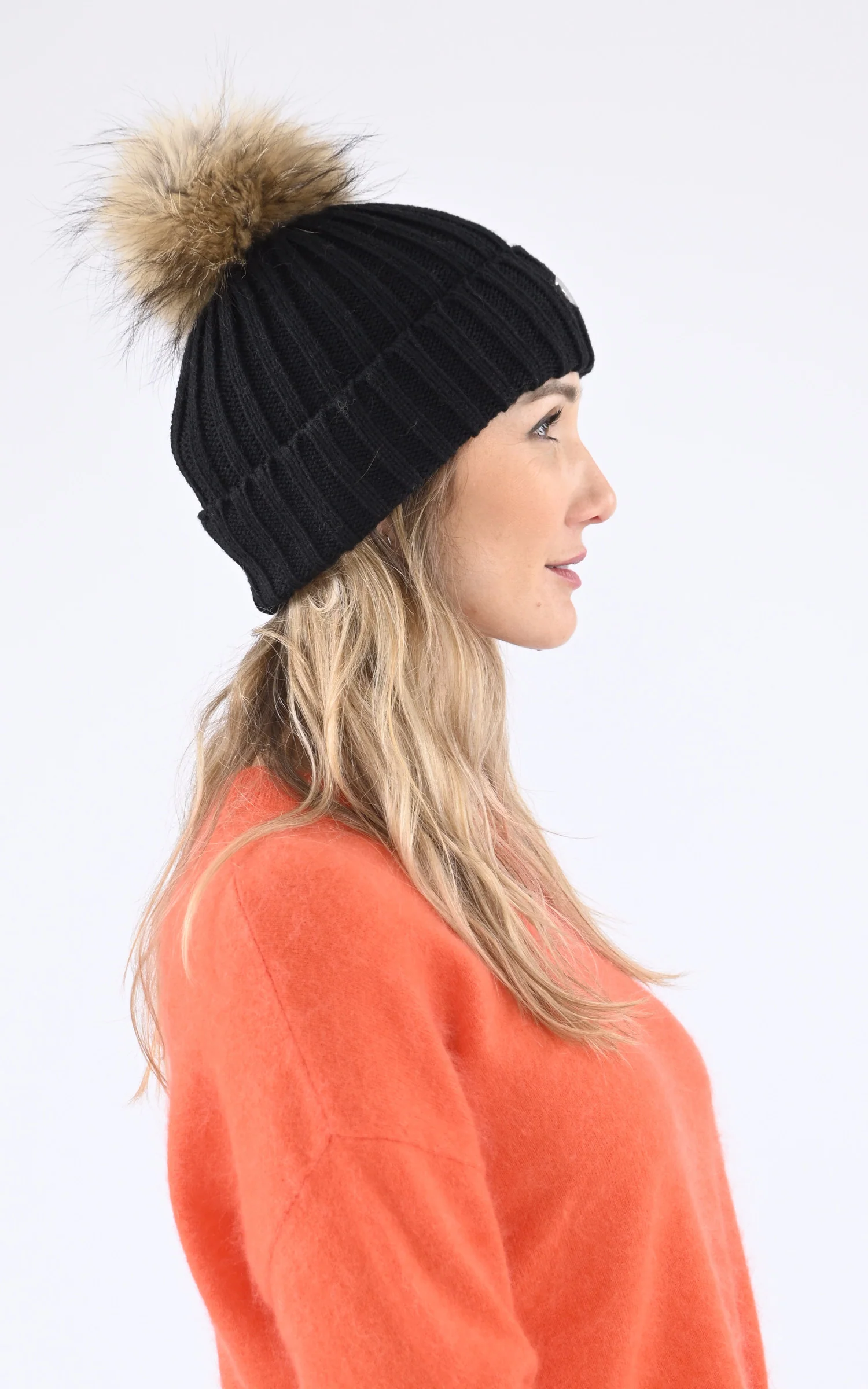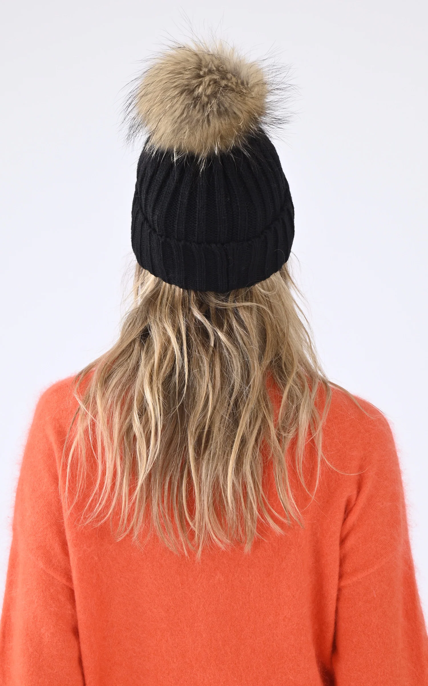 – Bonnet en maille grosses côtes– Pompon fixe en fourrure de raccoon– Badge métallisé Rock and Blue sur le devant