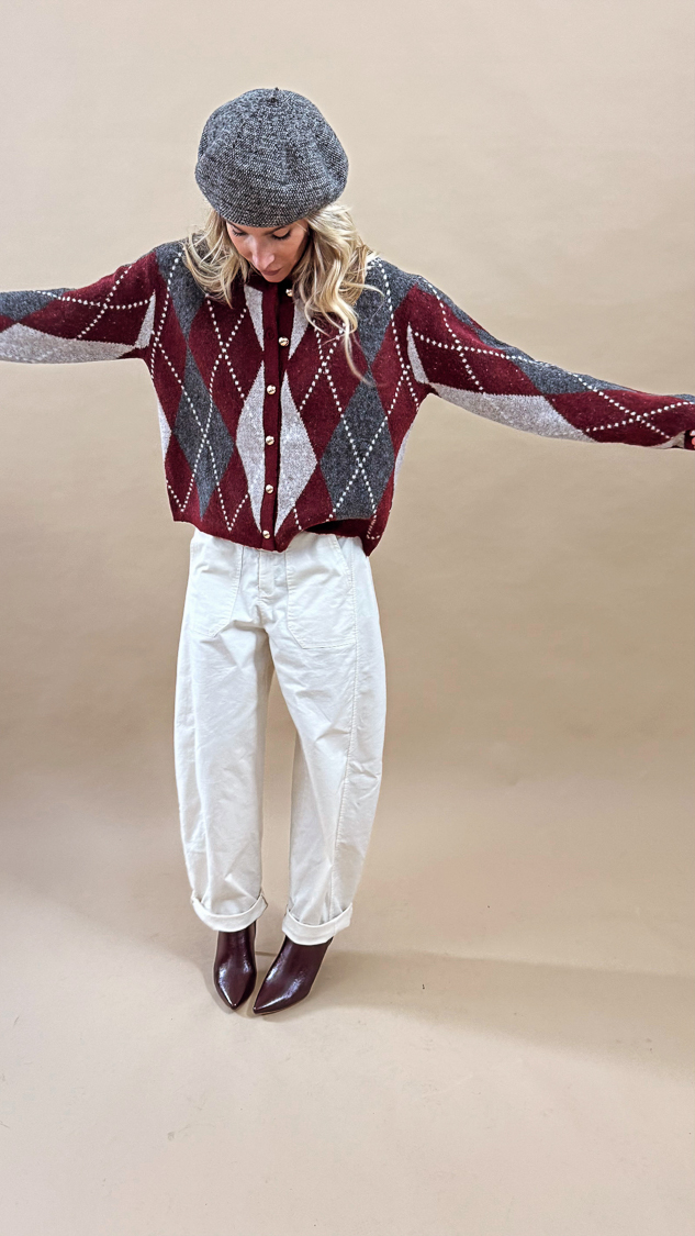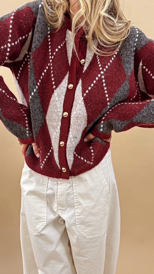 Cardigan bordeaux à motifs losanges et boutons dorés