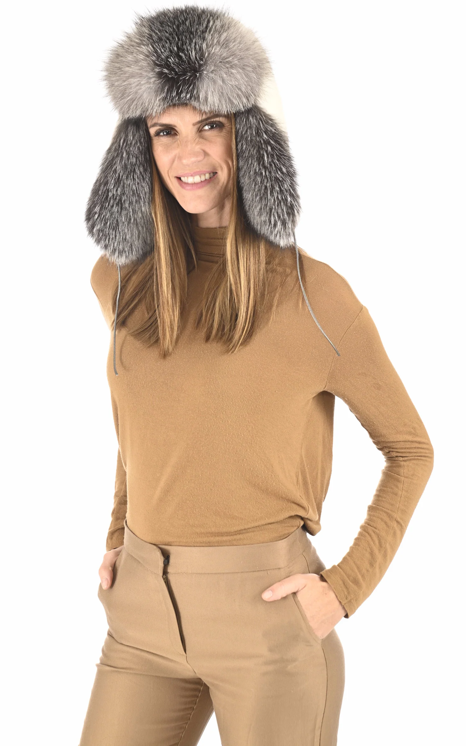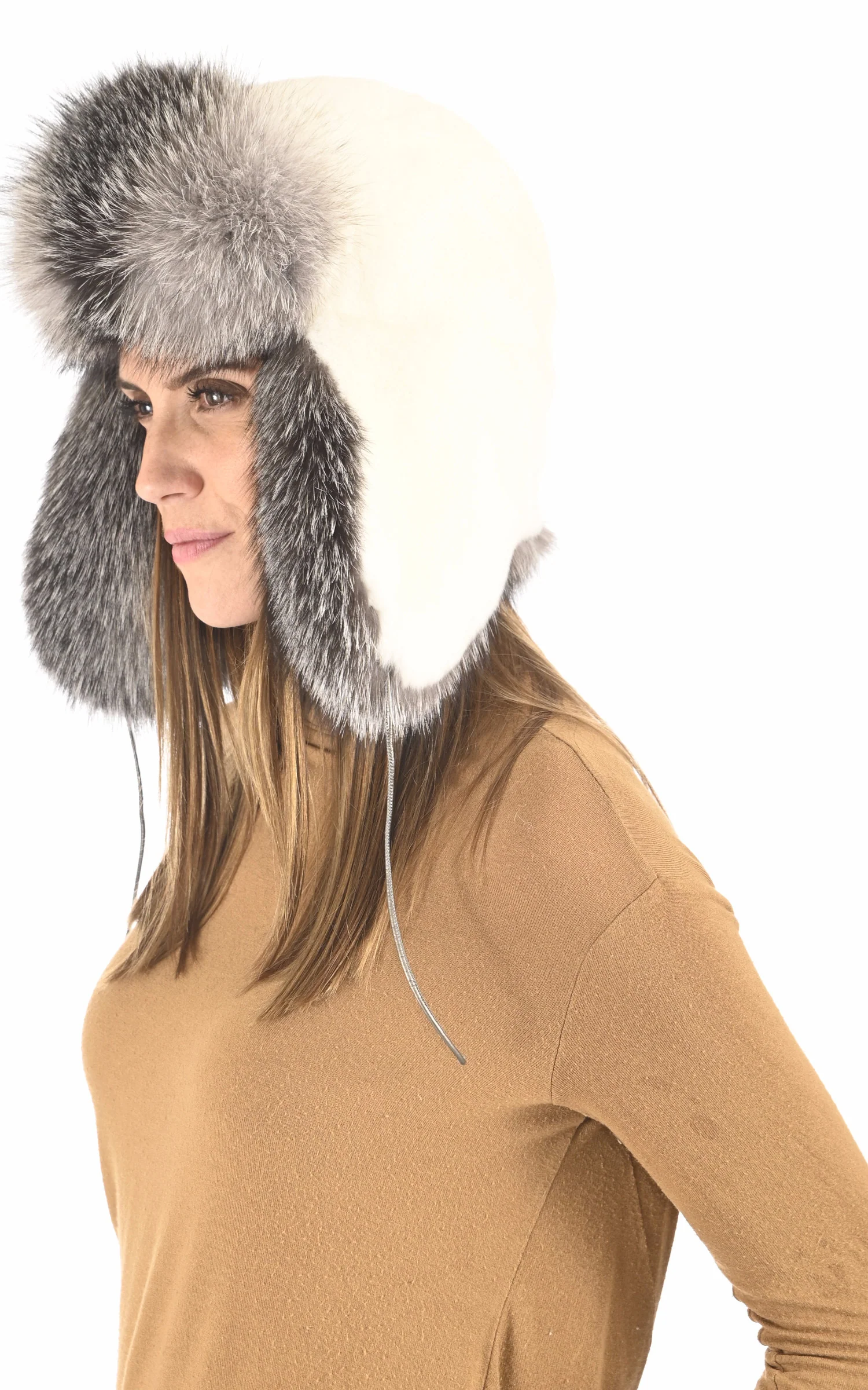Chapka en fourrure de lapin Rex teinté blanc et bordée de fourrure de renard argenté couleur naturelle finlandais label Saga Fur
