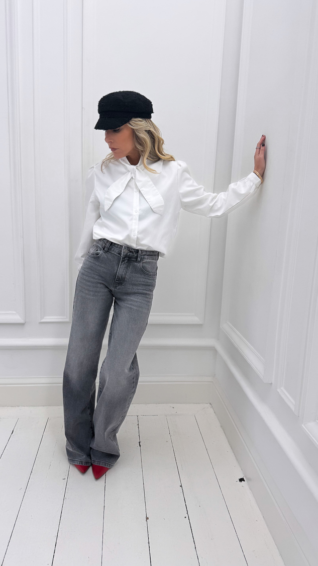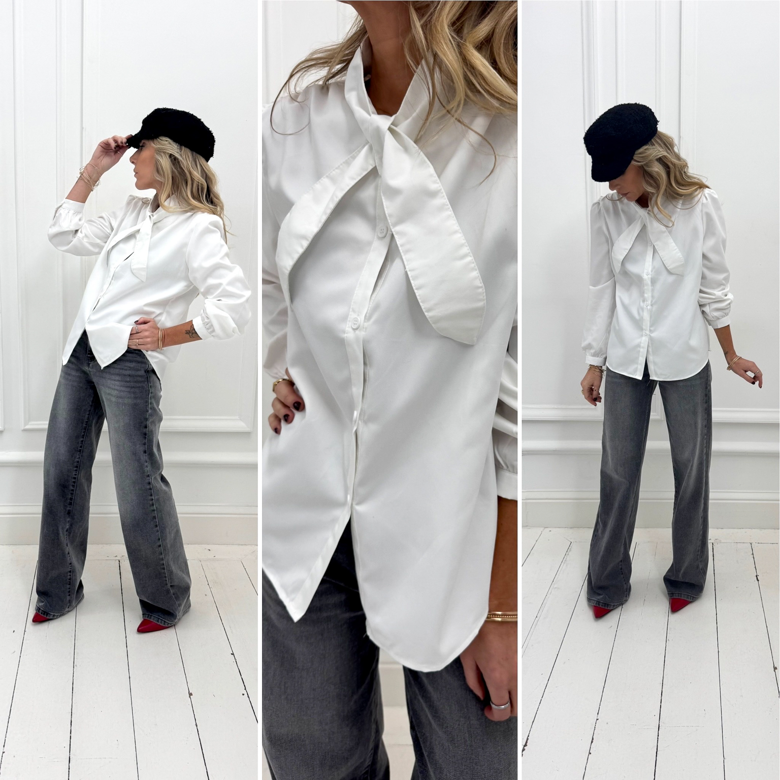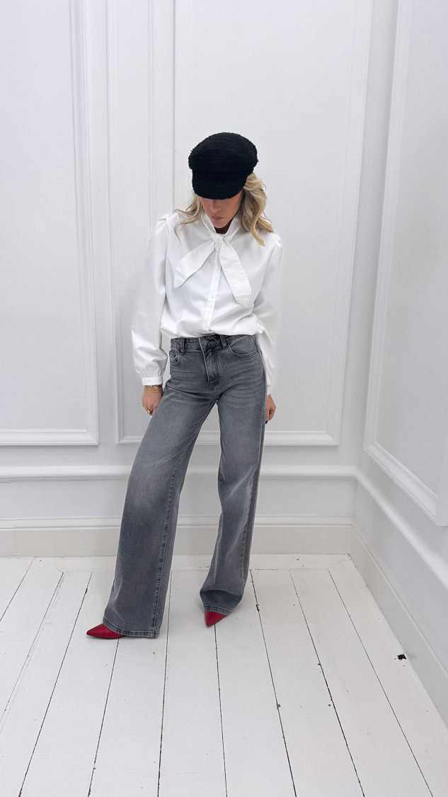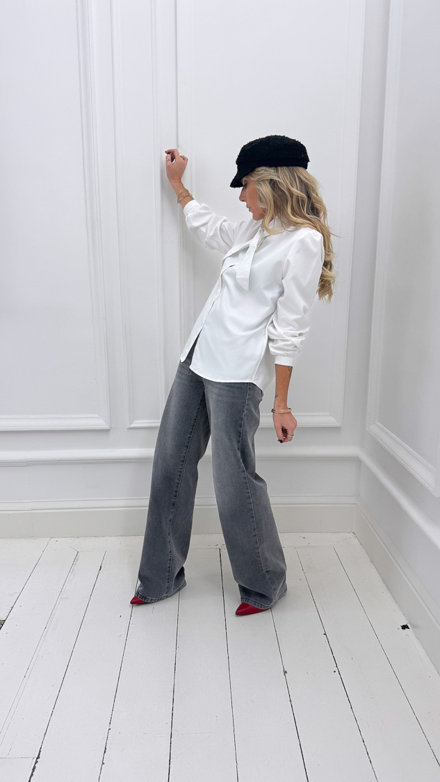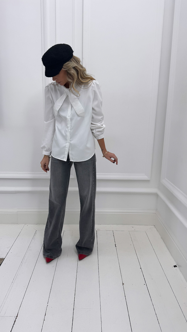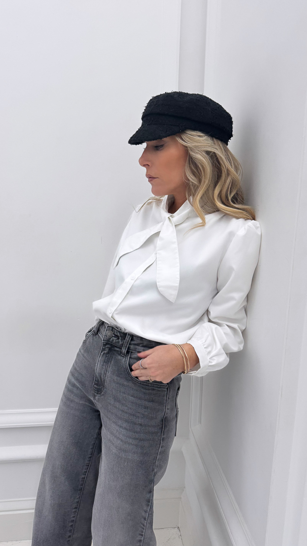 Cette chemise blanche, avec son col croisé et sa texture effet peau de pêche légèrement bouffante, s’accordera parfaitement avec un jean !