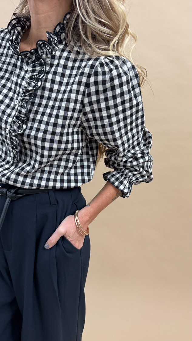 Chemise vichy noire et blanche à carreaux, un incontournable du dressing. Elle se distingue par son col ondulé brodé et ses finitions en dentelle noire, qui apportent une touche élégante et féminine. Les manches sont resserrées aux poignets par un élastique, créant un léger volume pour une coupe structurée et confortable.