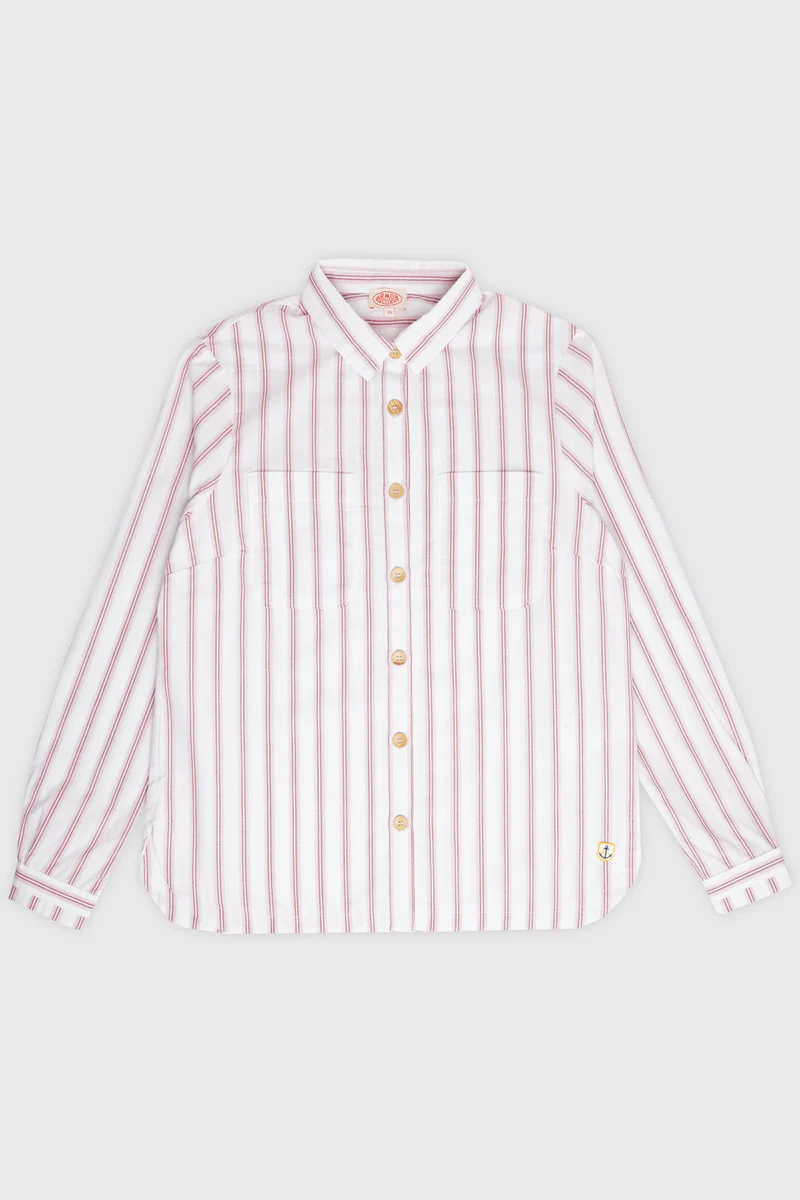 Cette chemise aux fines rayures verticales se porte aussi bien avec un pantalon en lin qu’un short pour les beaux jours.