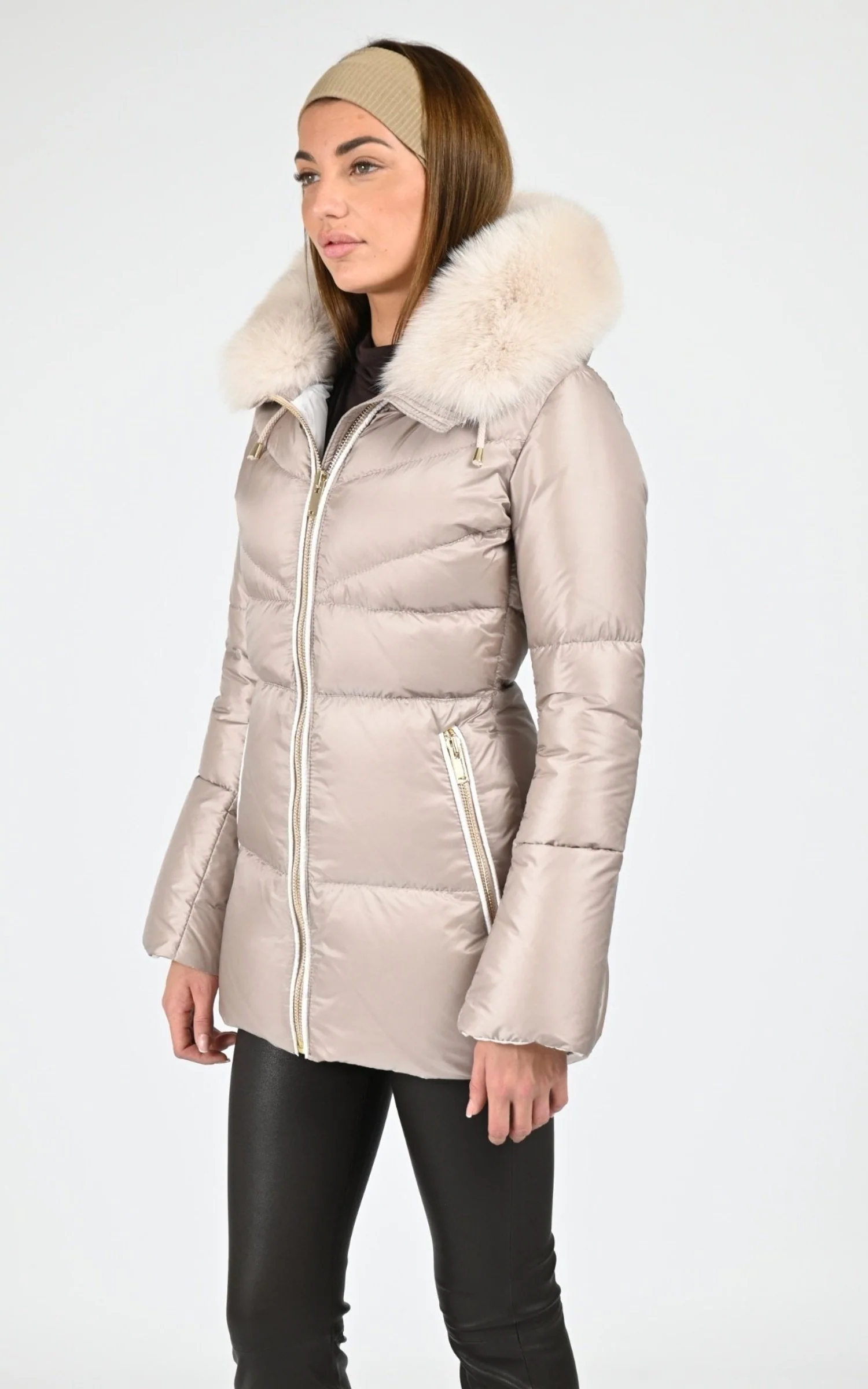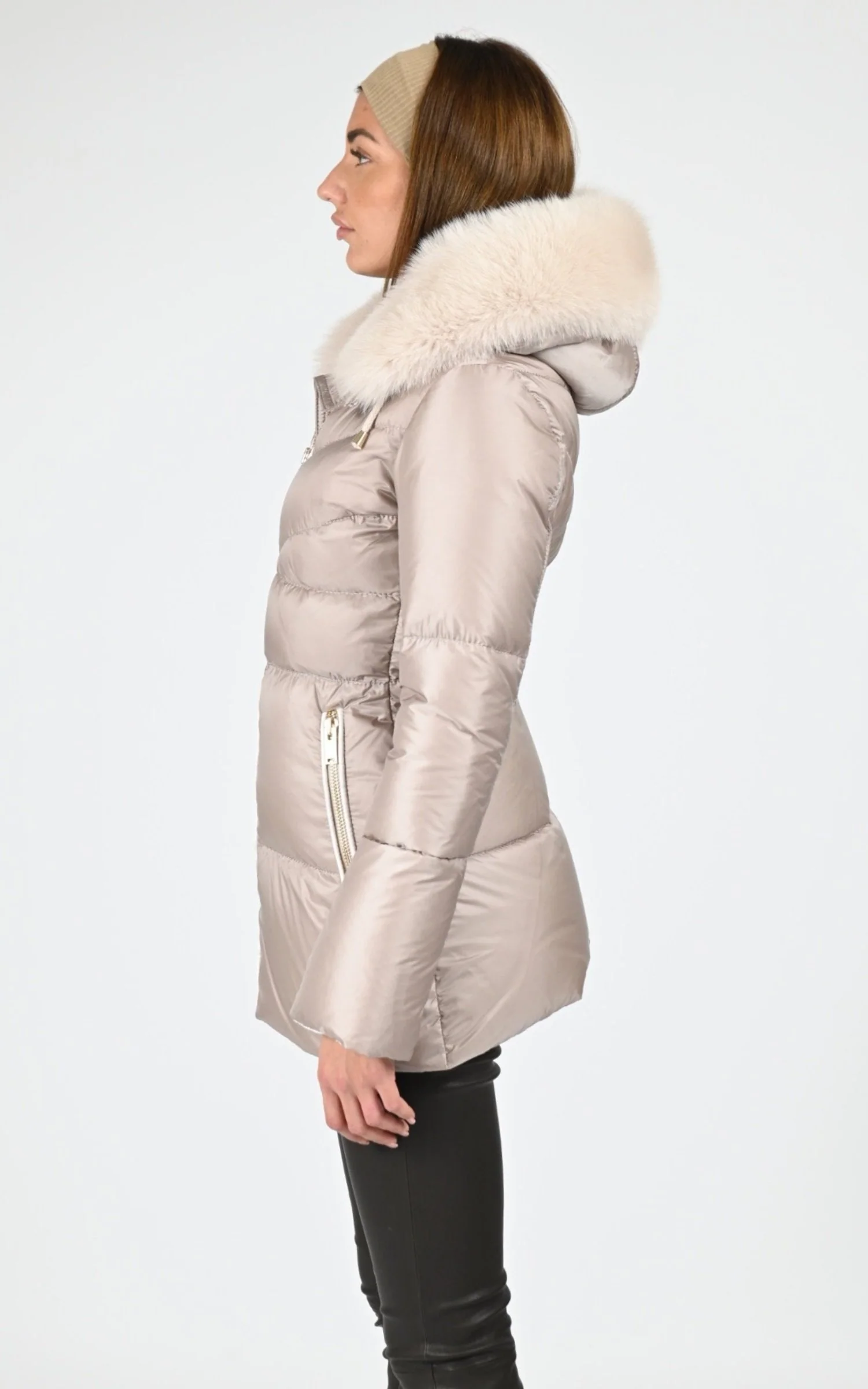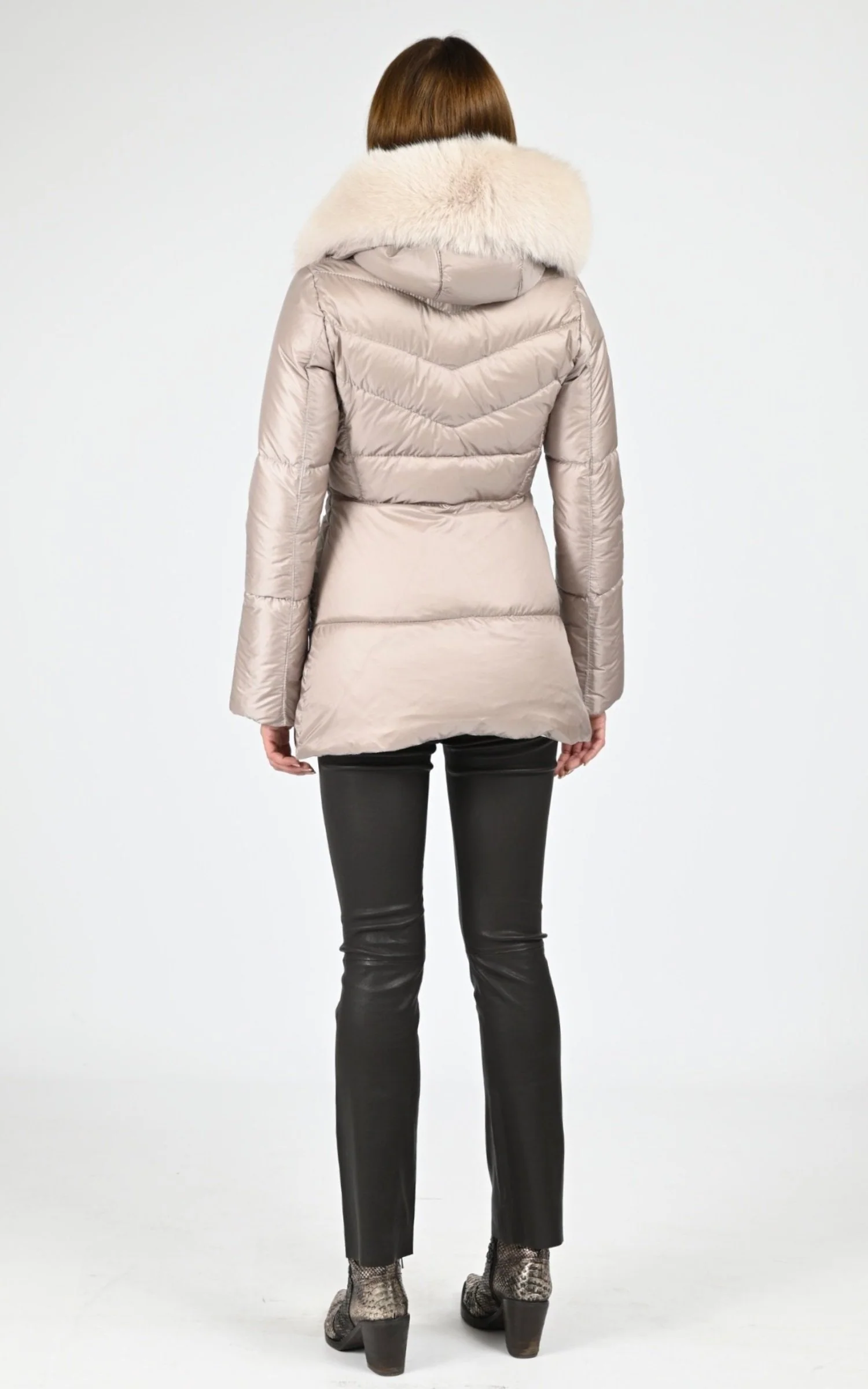 – Capuche fixe dotée de cordons de serrage et bordée de fourrure de renard bleu finlandais teinté Label Saga Fur amovible par boutons