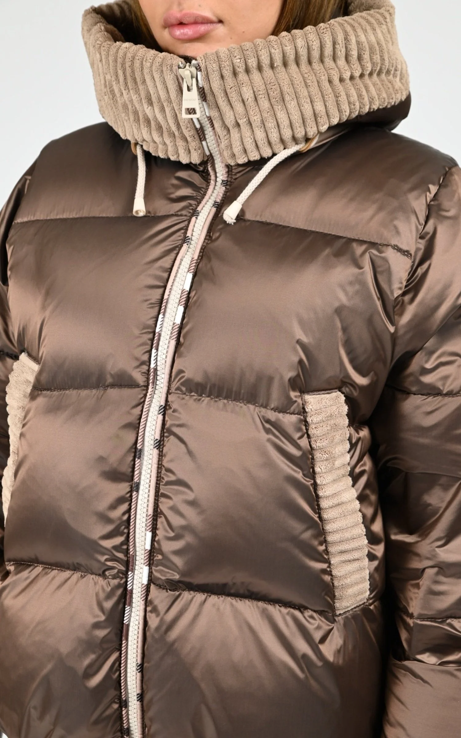 – Capuche fixe avec empiècement en velours côtelé et dotée de cordons de serrage