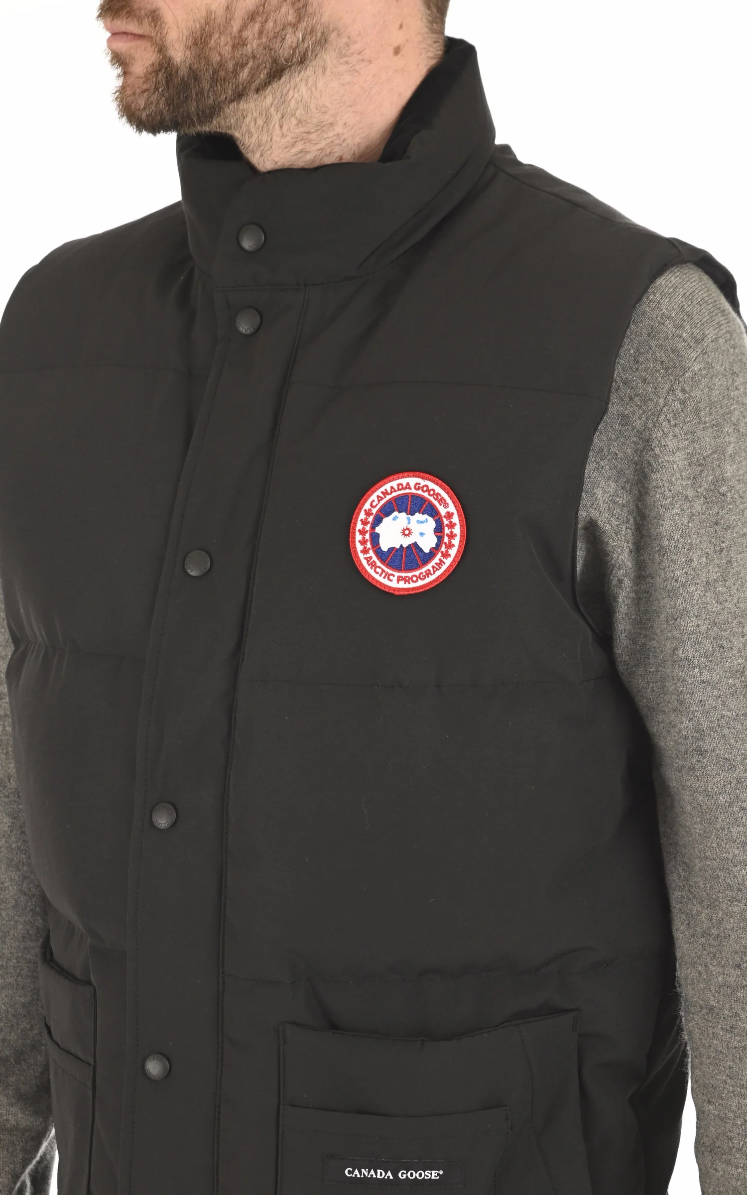 Gilet modèle Freestyle Col montant intérieur polaire 2 double poches extérieures doublées polaire2 poches intérieures Logo Canada Goose original sur la poitrineFermeture zip double curseur à rabat pression