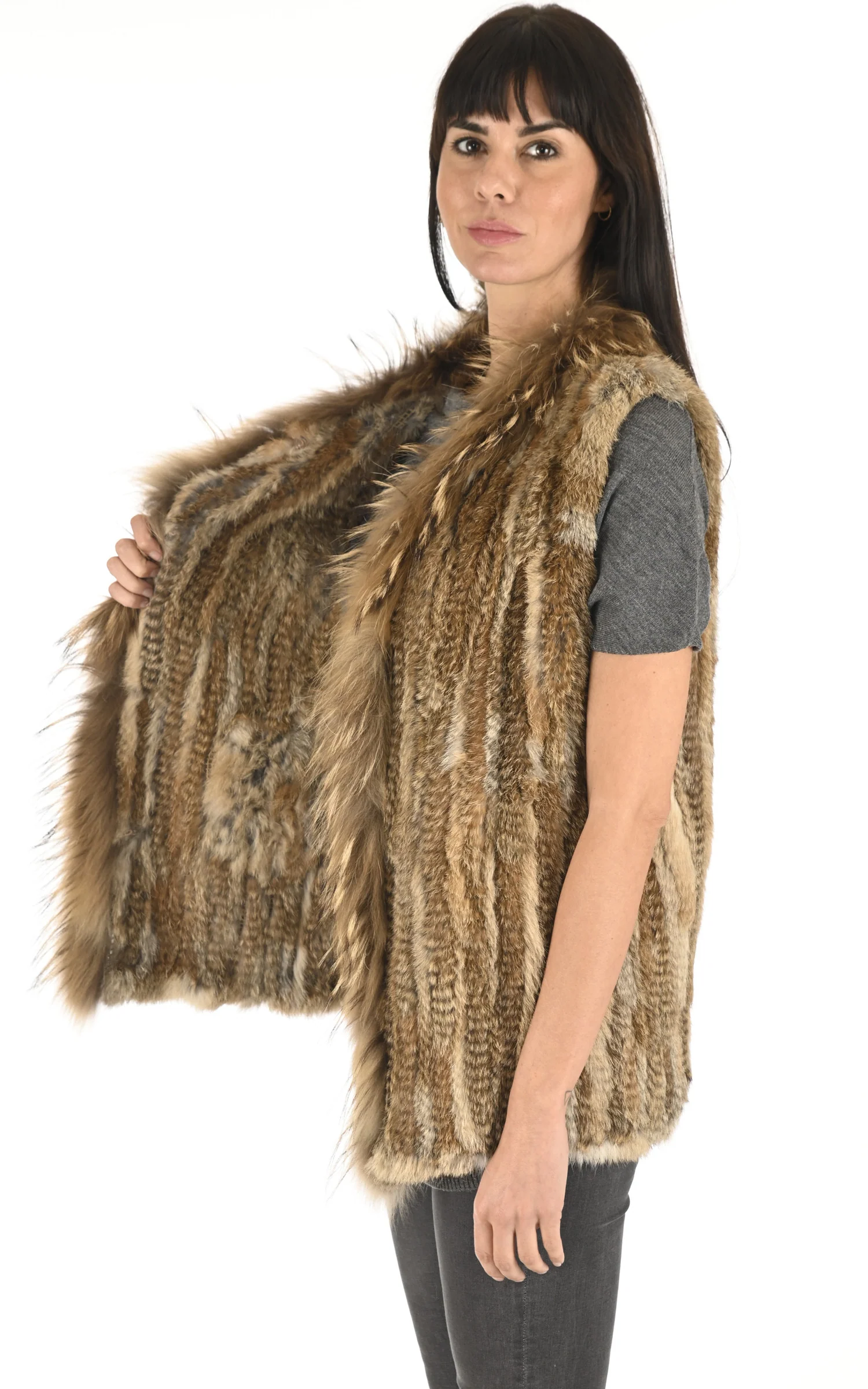 Gilet long en fourrure tricotée de lapin couleur naturelle