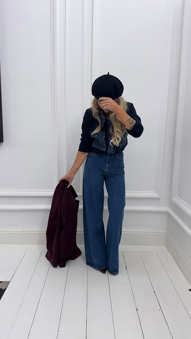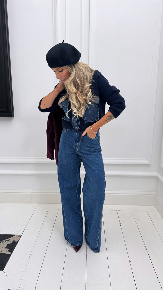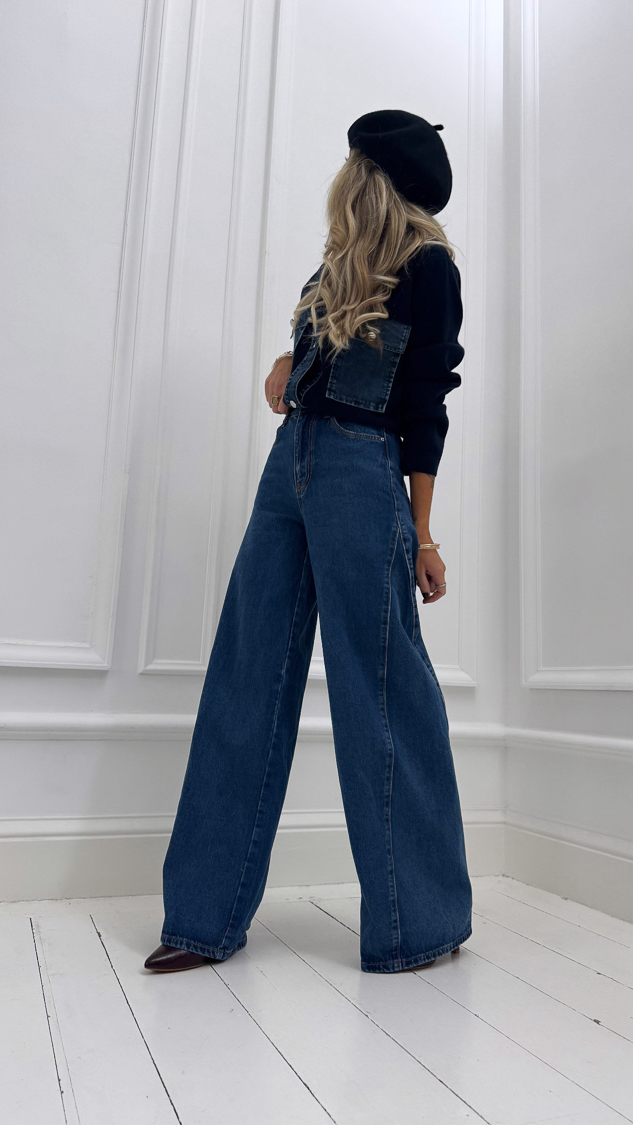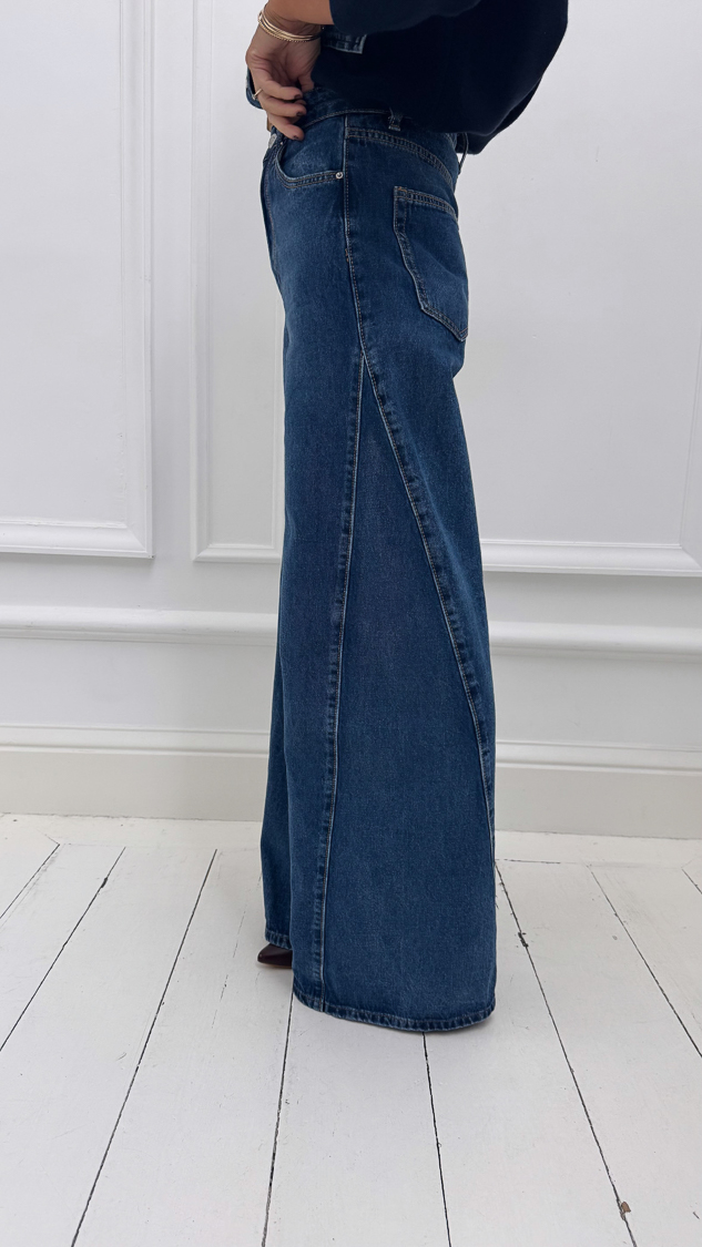 Le jean bleu large, taille haute, avec couture diagonale sur la jambe. Moderne, structuré et plein de caractère !