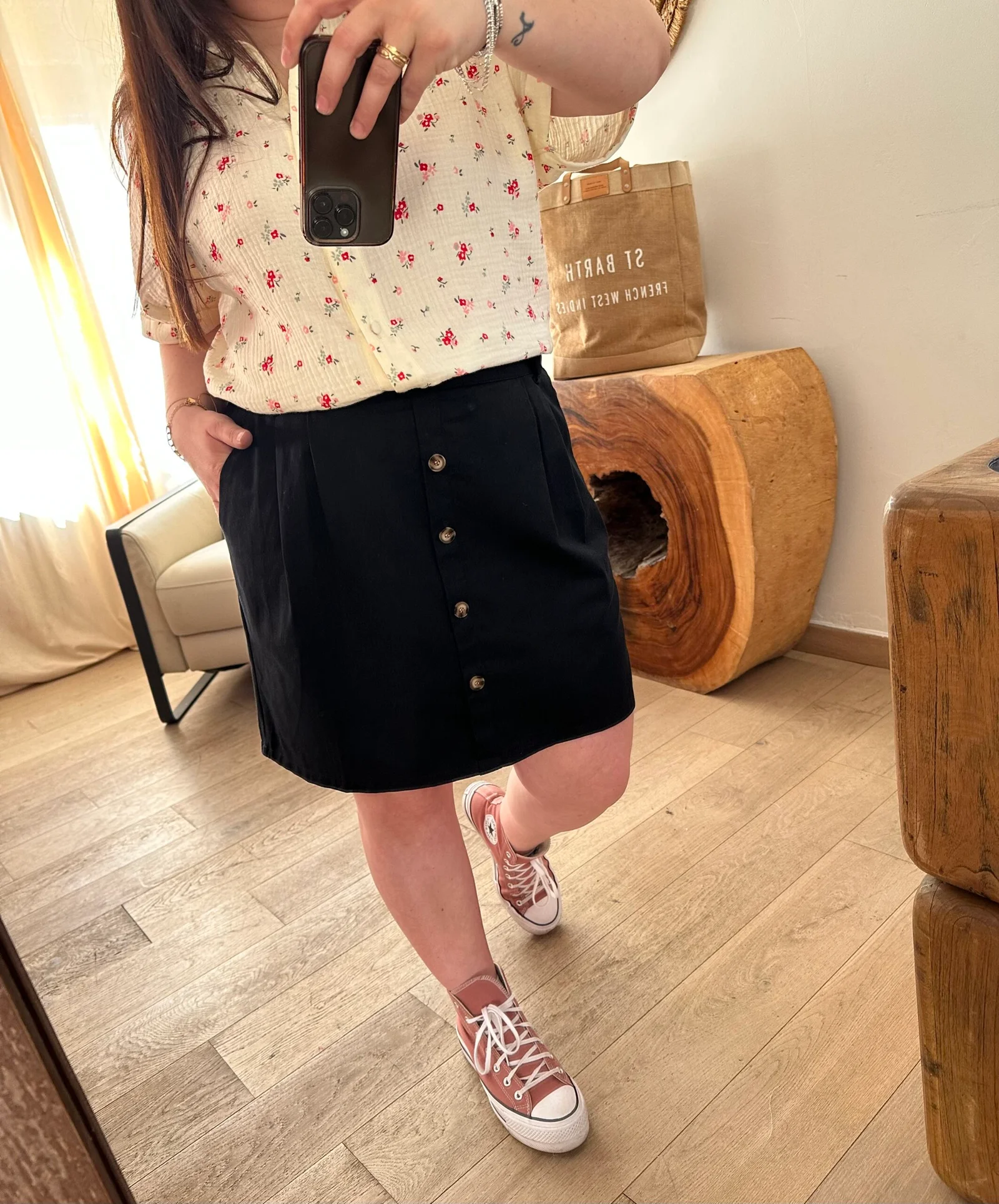 Le model porte habituellement une taille 44/46 et mesure 1m60. Elle porte la jupe en taille 46.