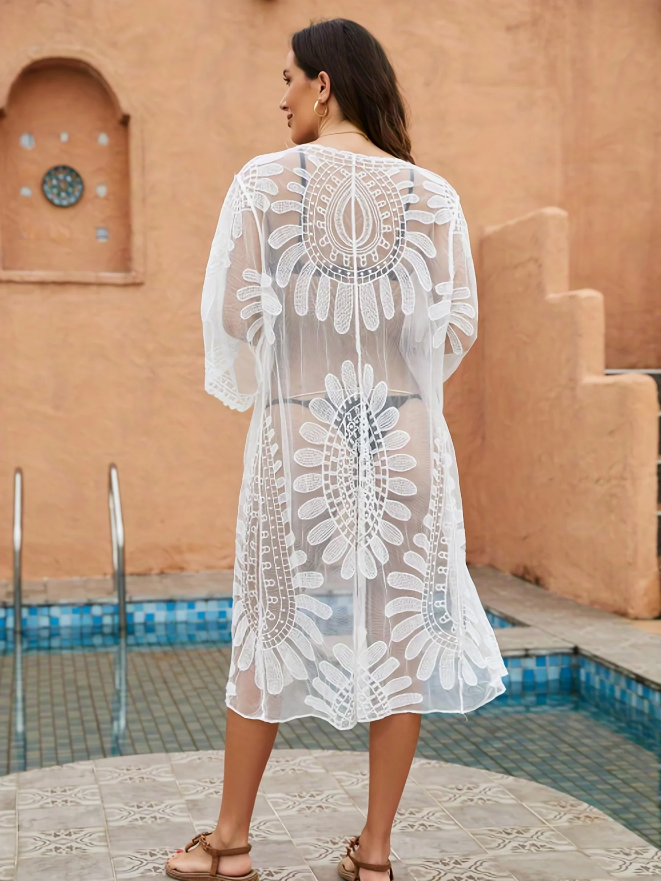 Sublimez vos journées ensoleillées avec ce kimono de plage en dentelle. Léger, fluide et délicatement ajouré, il est l’allié parfait pour rehausser vos tenues de bain avec raffinement.