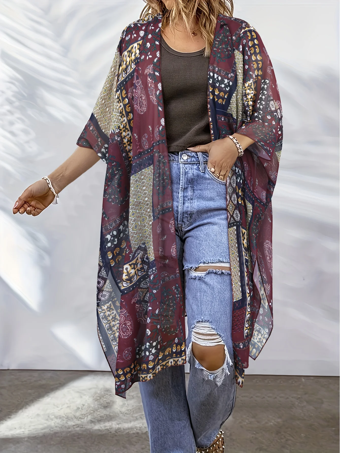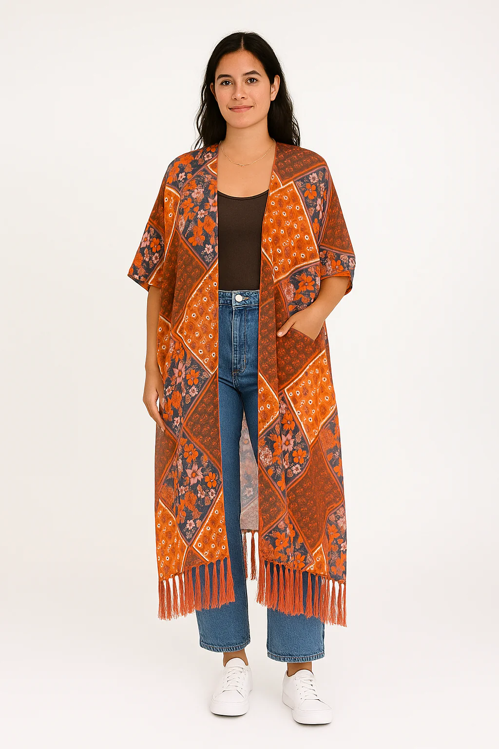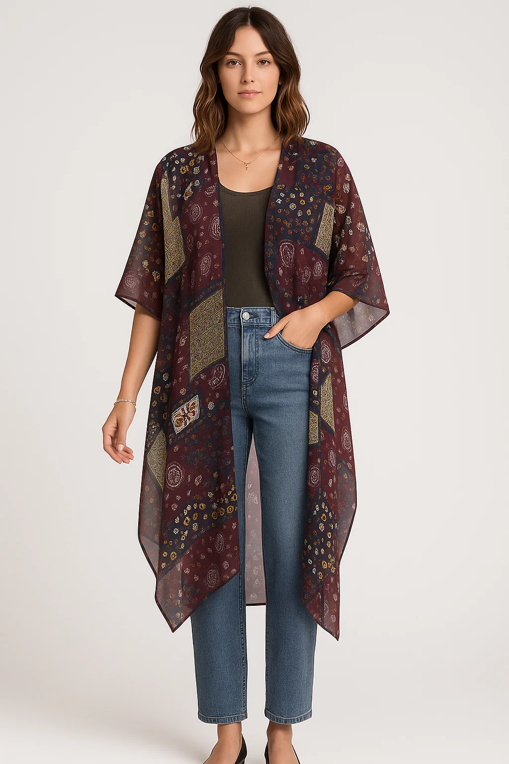 Ajoutez une touche de caractère à vos tenues avec ce kimono fluide à imprimé bohème. Confortable et ultra-stylé, il s’adapte aussi bien à vos journées détente qu’à vos looks urbains.