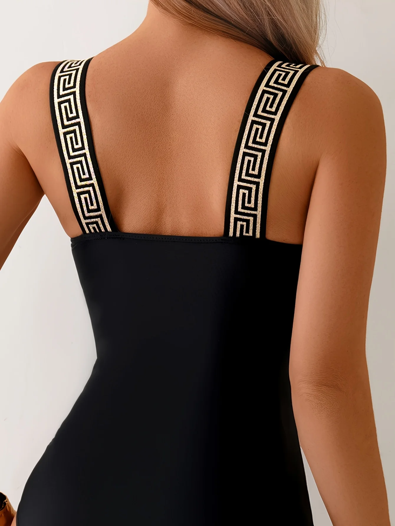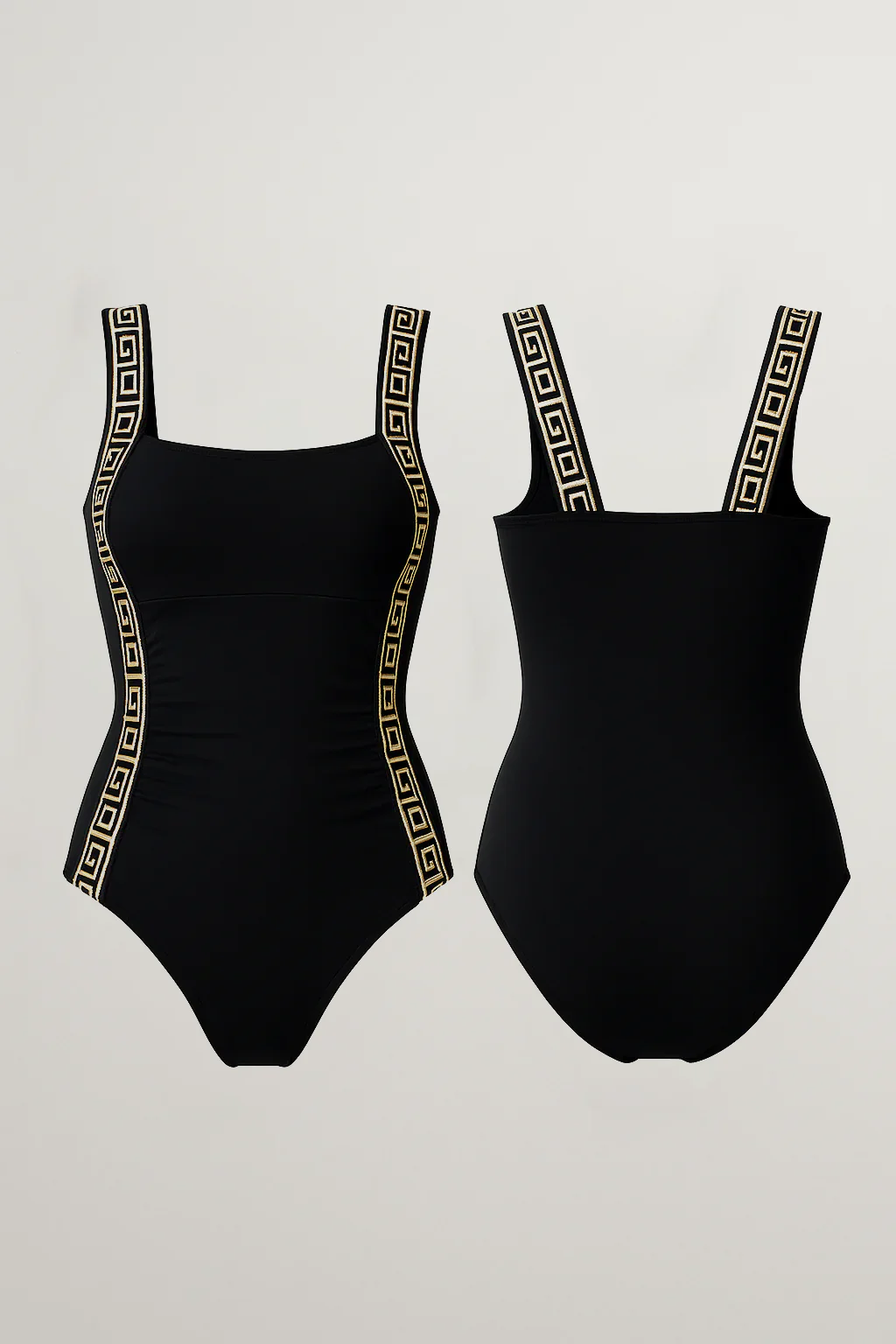 Maillot de bain 1 pièce galbant femme, orné de bandes dorées inspirées du motif grec, avec bretelles larges et coupe gainante chic, idéal pour sublimer la silhouette.