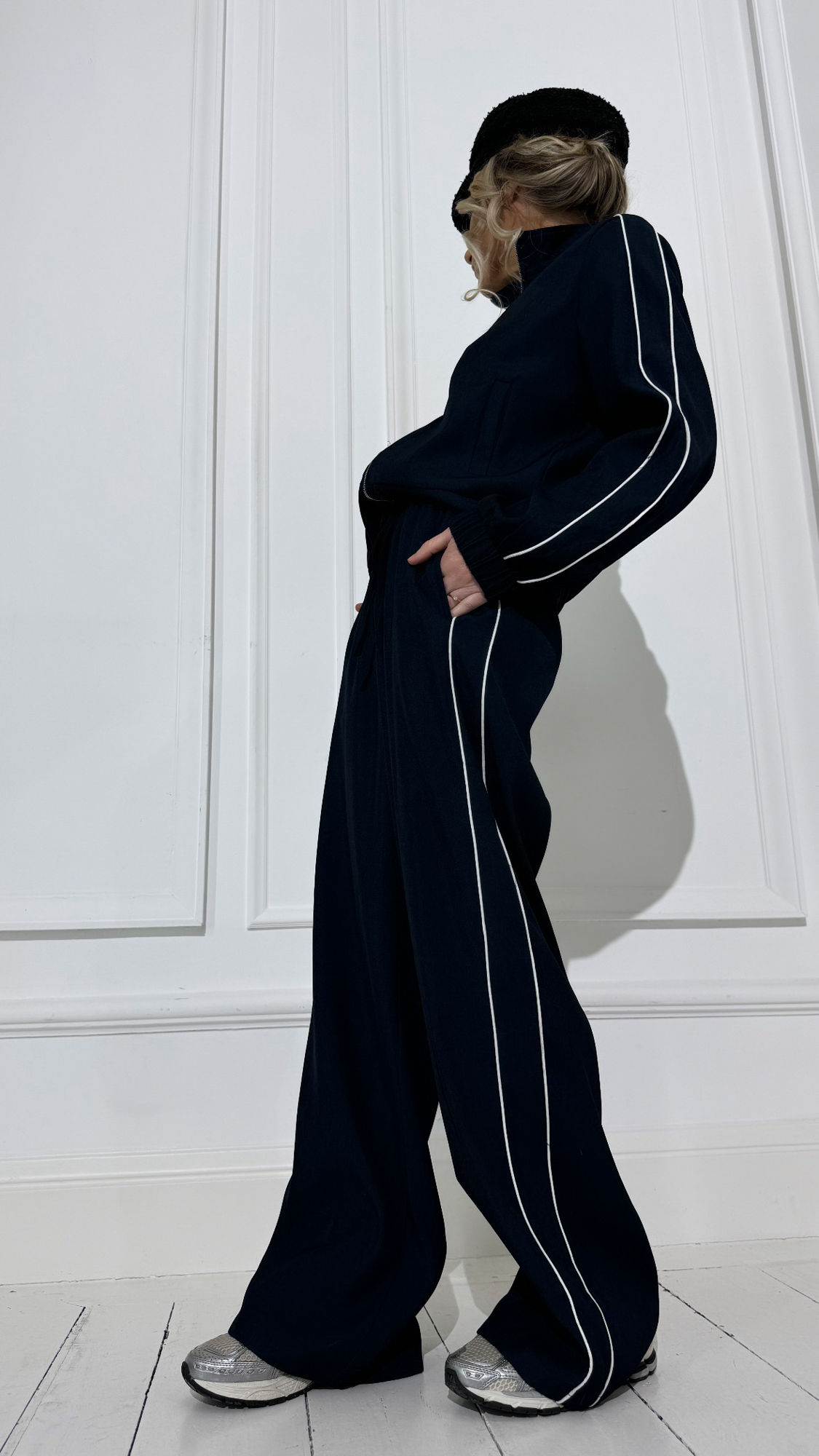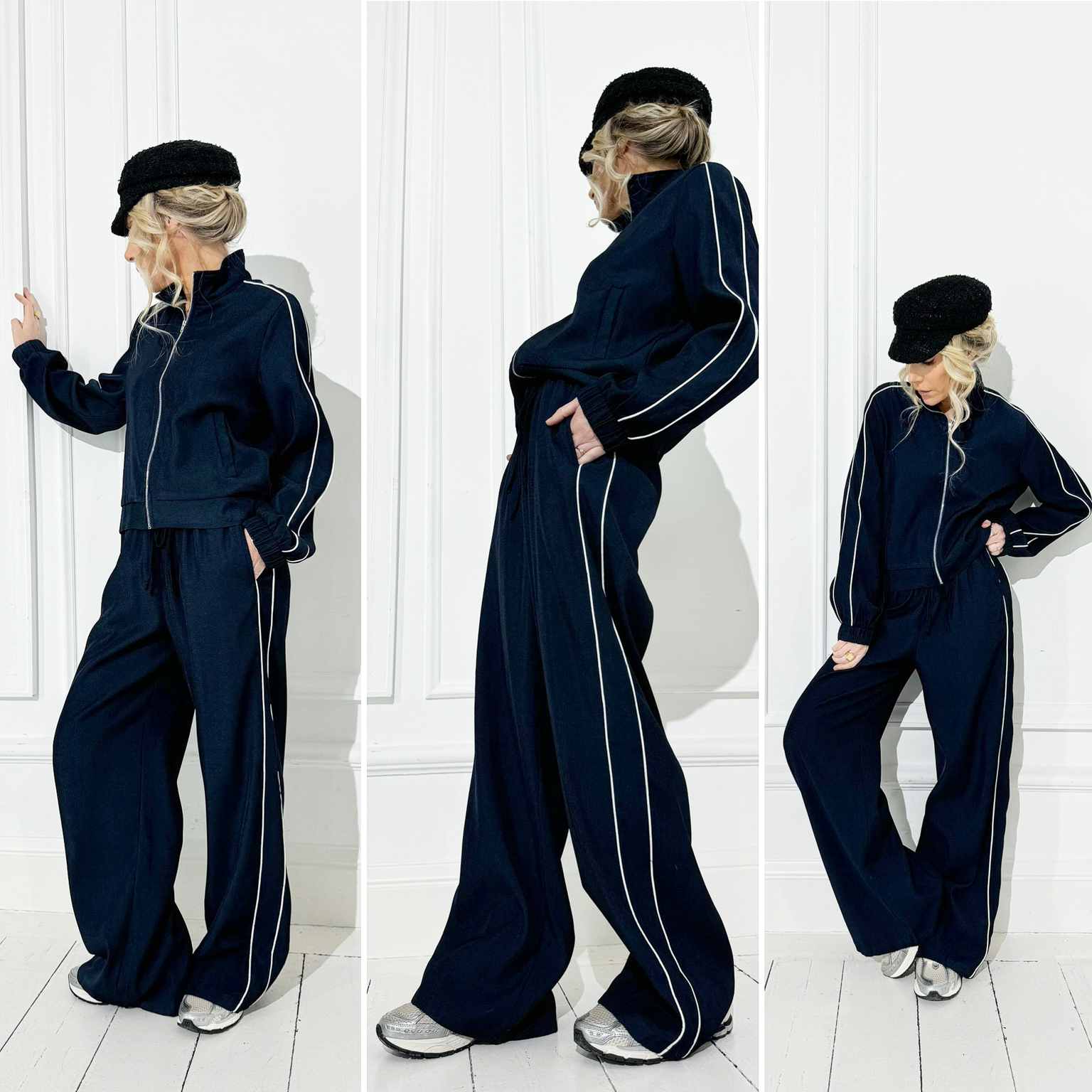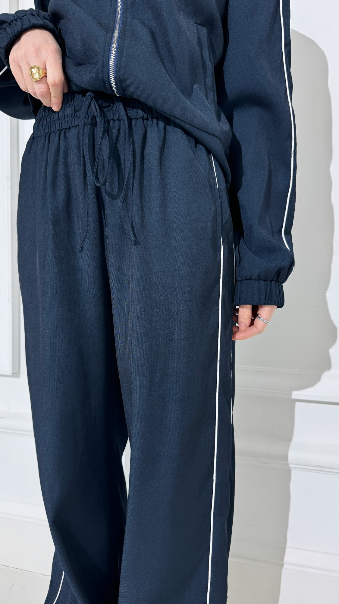La pantalon bleu avec bandes blanches, taille élastique, à associer à la veste bleue zippée !