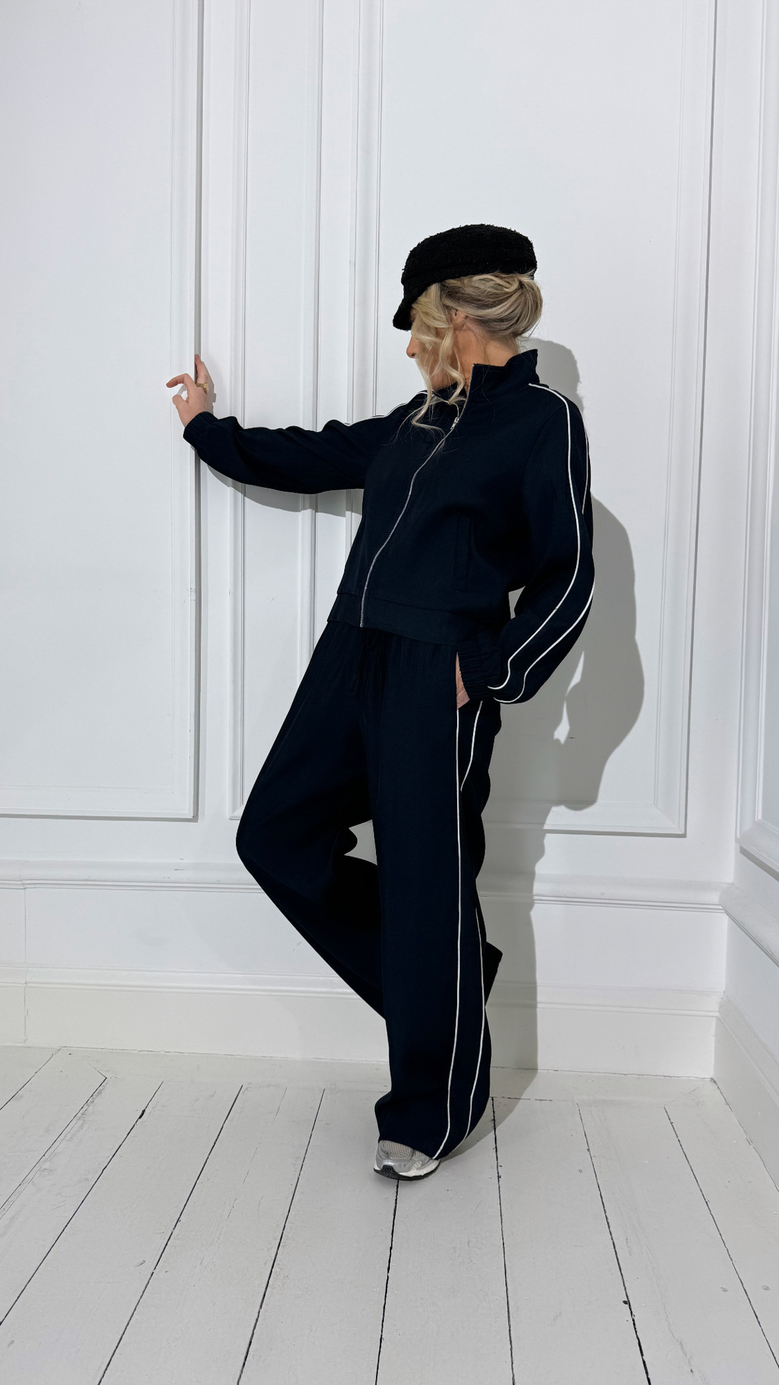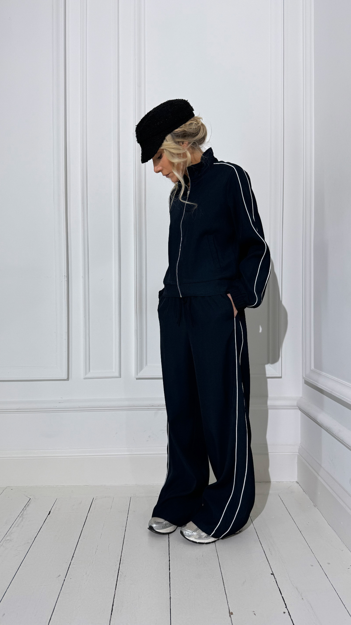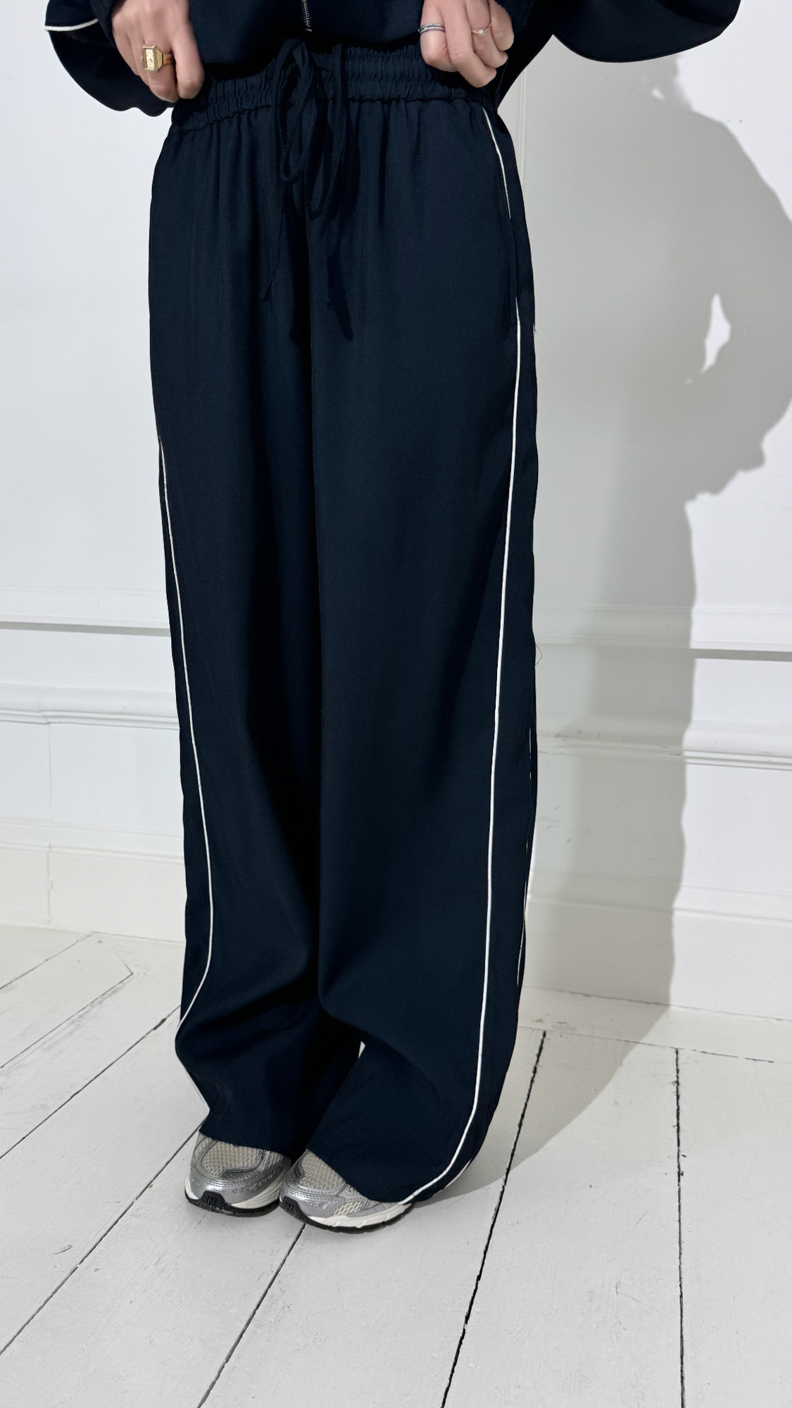 La pantalon bleu avec bandes blanches, taille élastique, à associer à la veste bleue zippée !