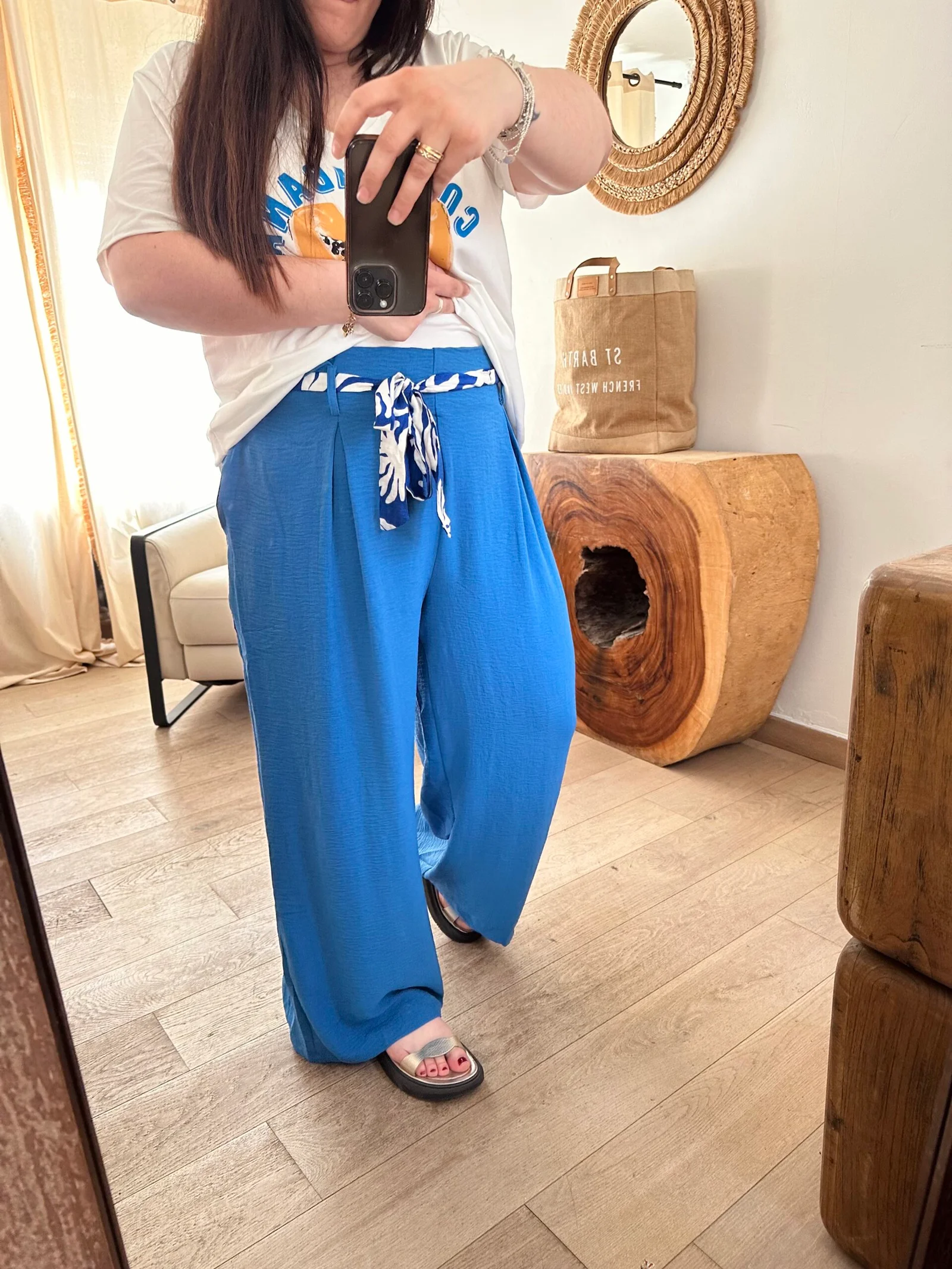 Pantalon fluide coupe large, taille élastique au dos avec ceinture fournie.