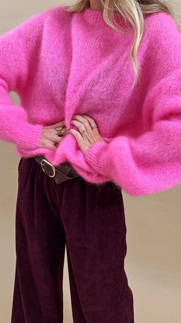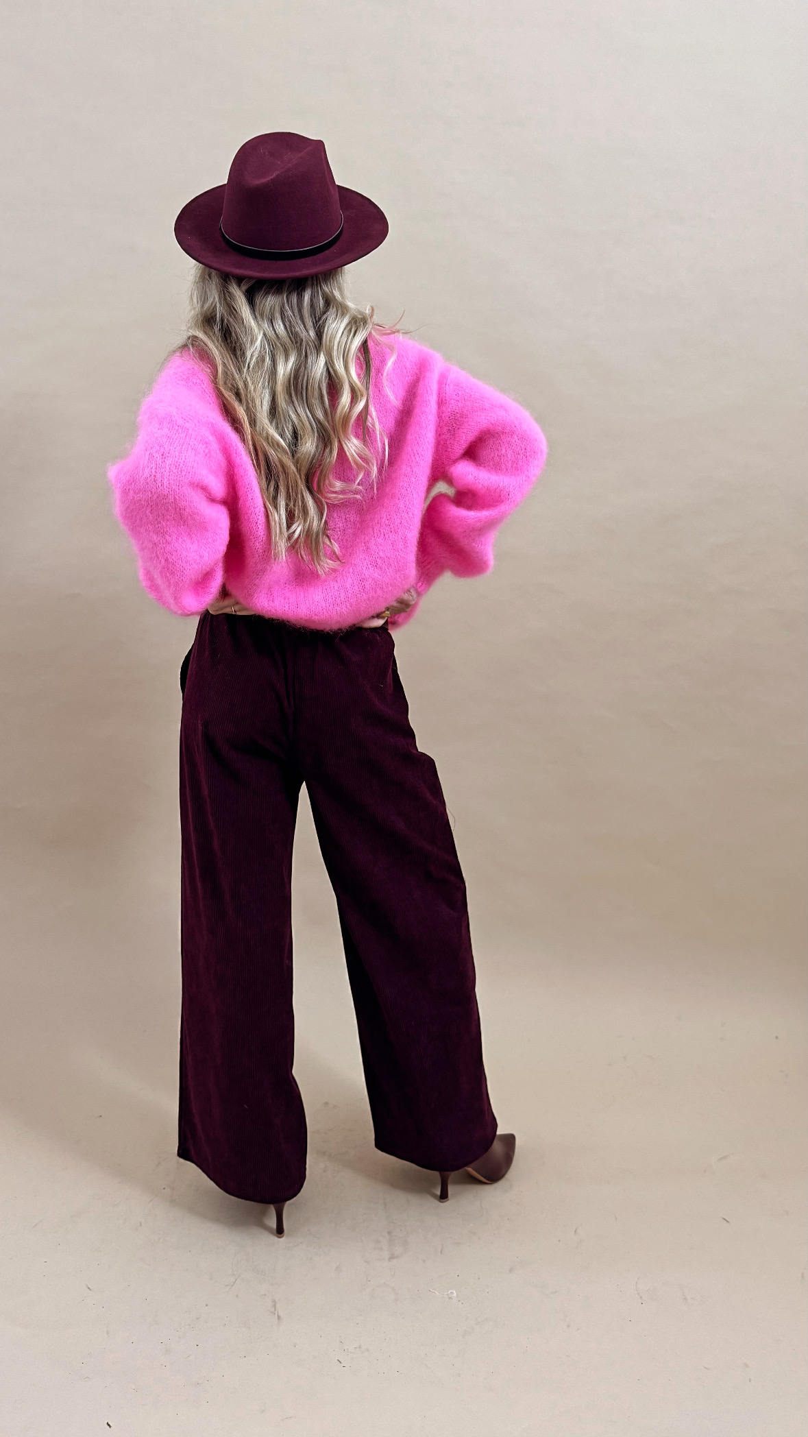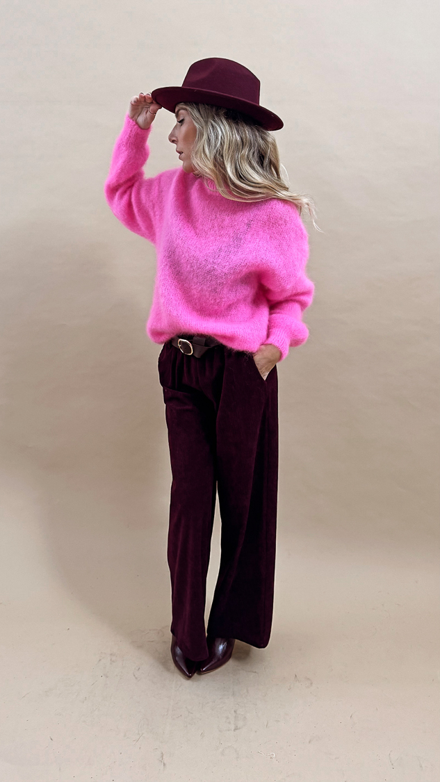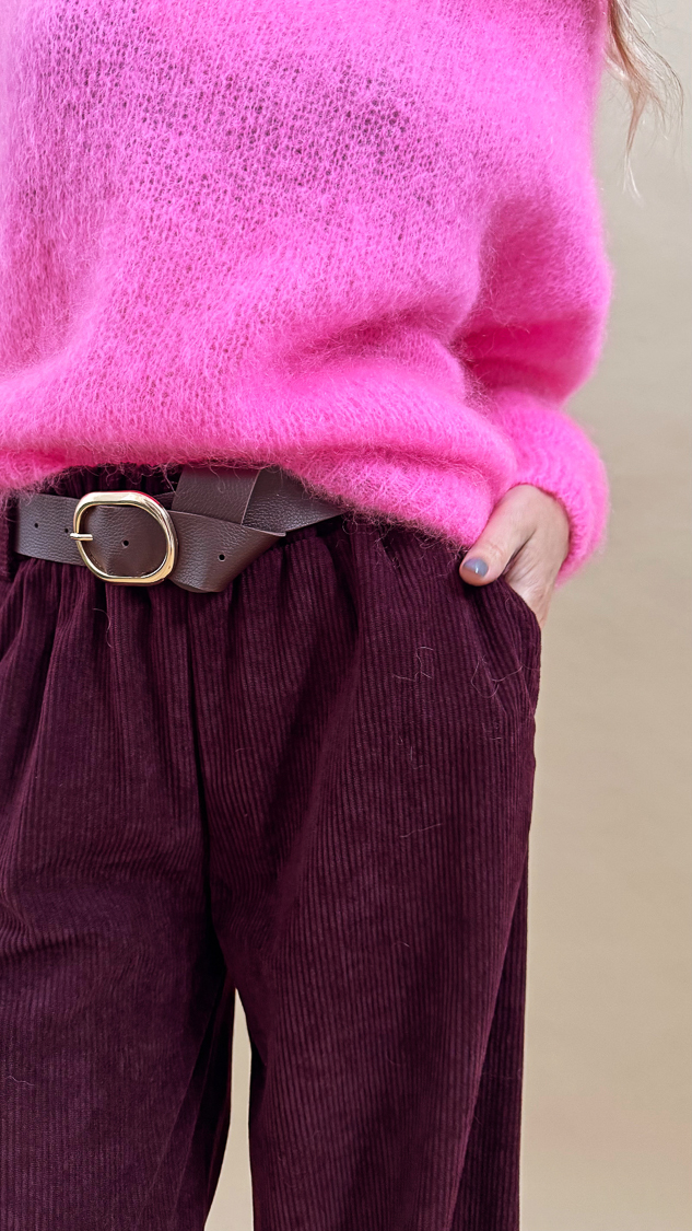 Le pantalon prune en velours côtelé et sa ceinture marron foncé, sa taille élastique et sa forme évasée!