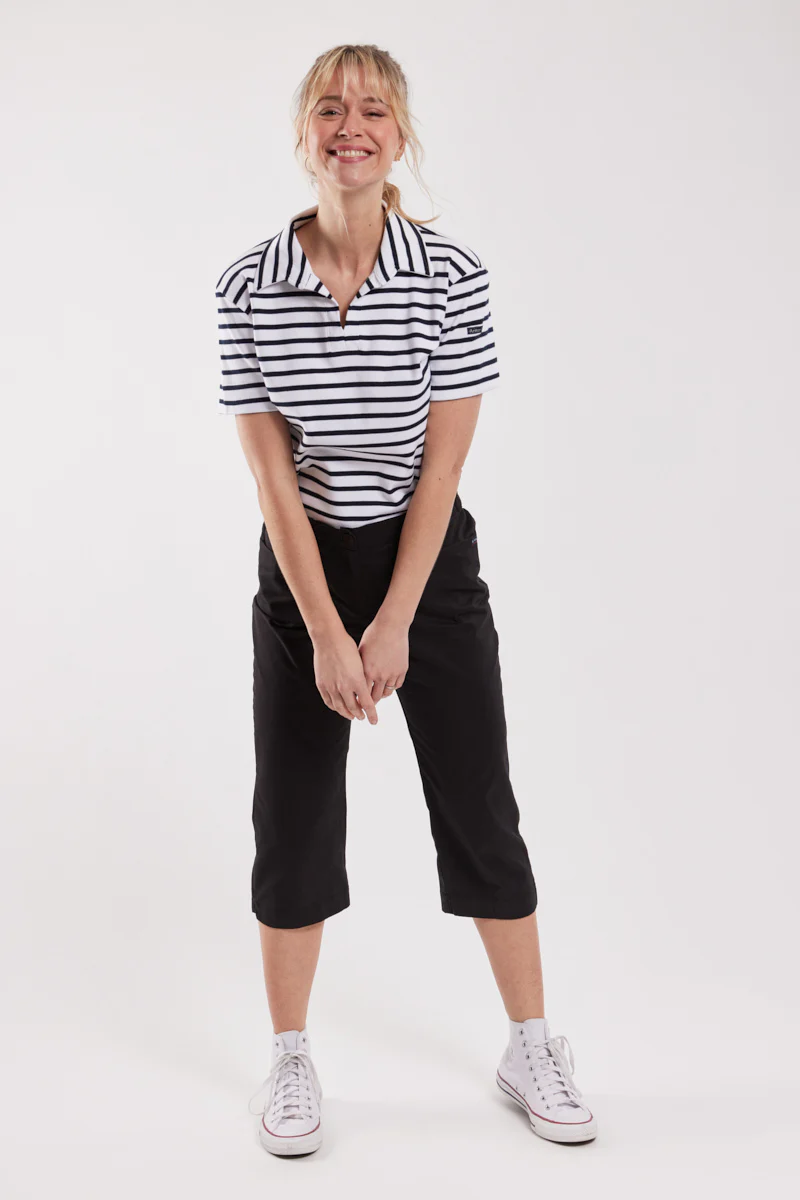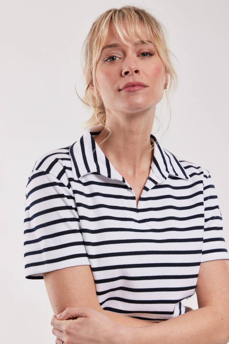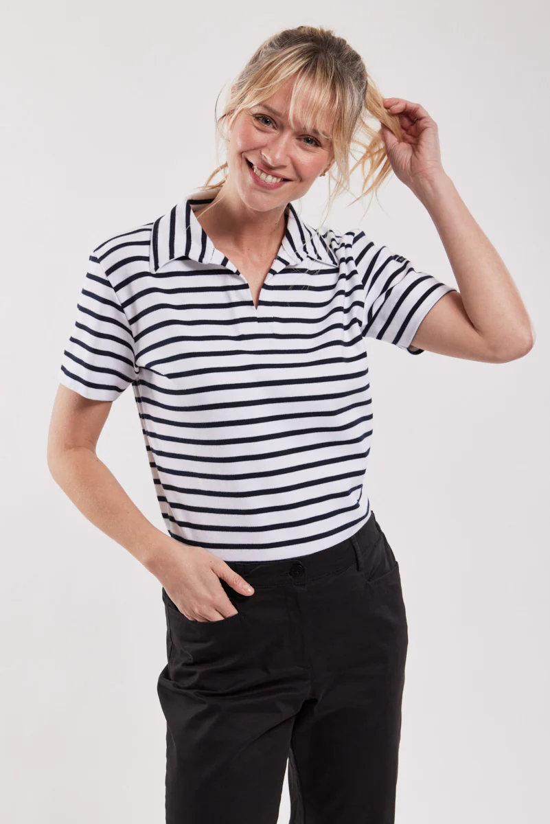 L’association du col polo et de la rayure donne à ce modèle un look subtilement moderne.