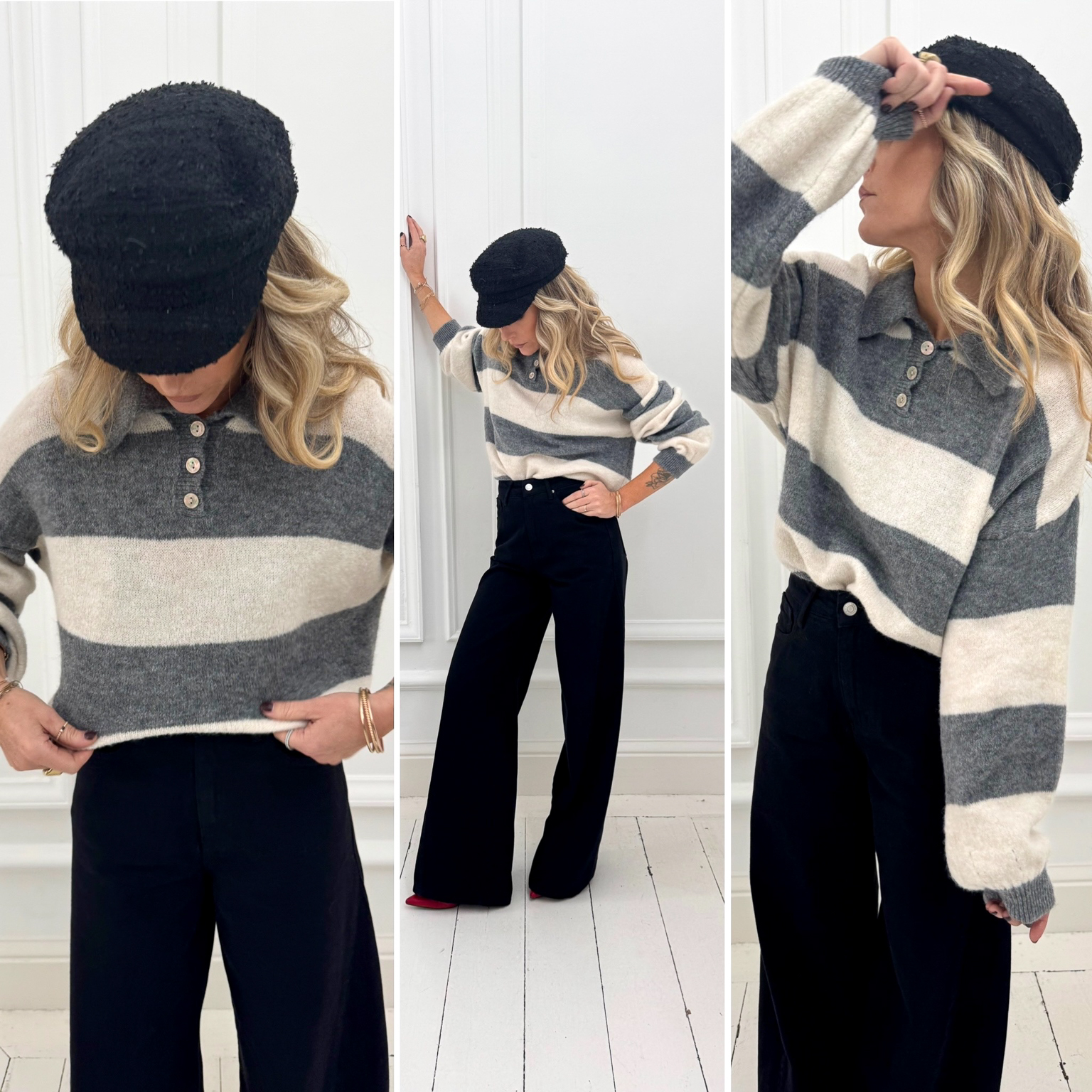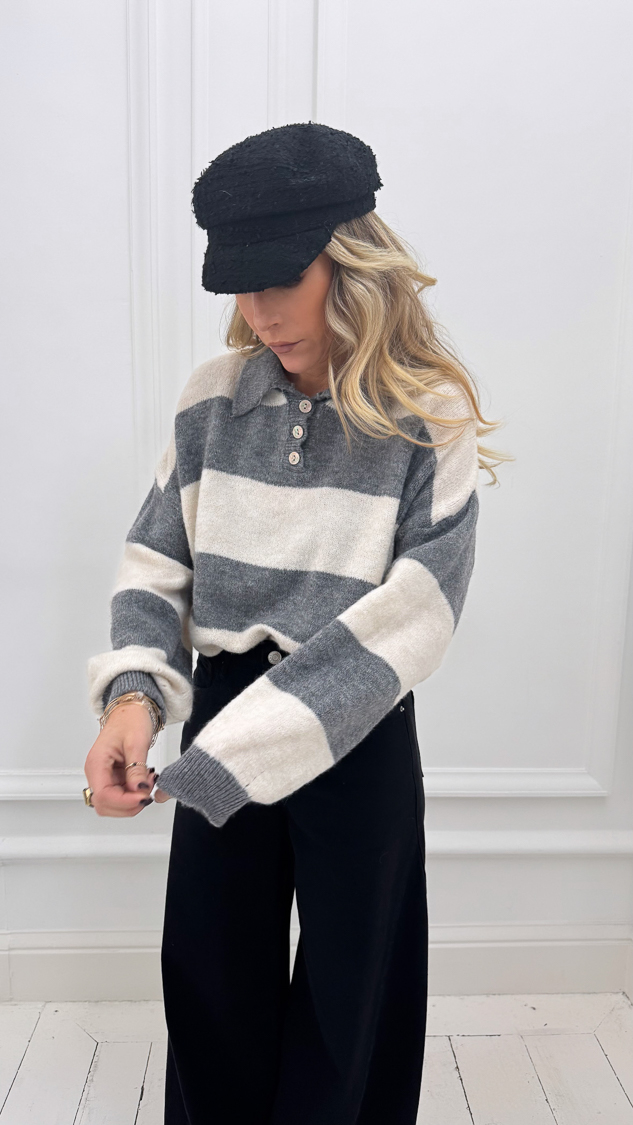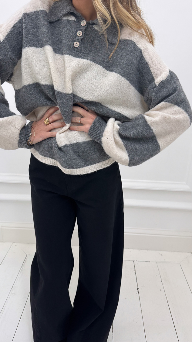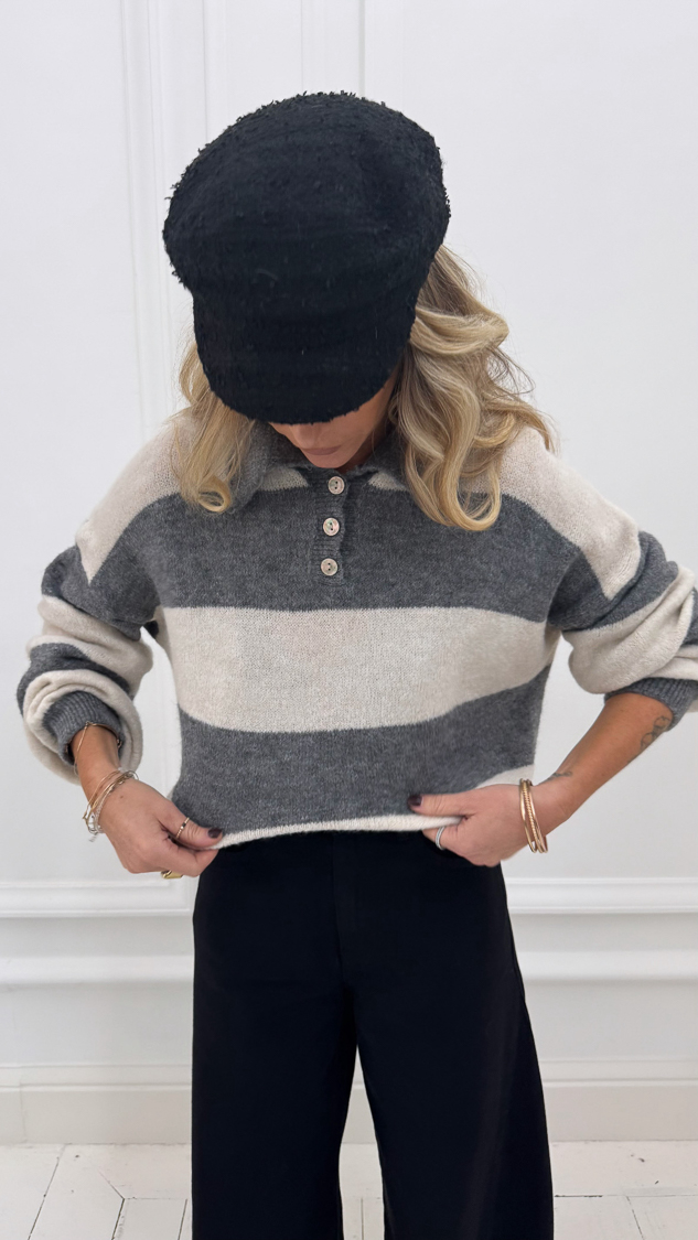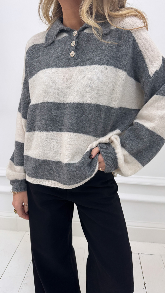 Le pull gris à rayures blanches et grises, doté d’un col chemise à trois boutons, sera parfait pour un look confortable et décontracté !