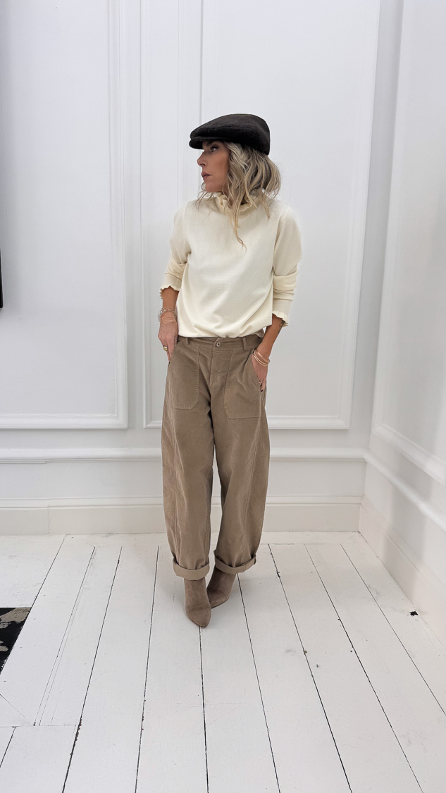 Ce pull écru séduit par sa maille douce et confortable. Son col et les extrémités des manches finement plissés ajoutent une touche d’élégance et de féminité à une pièce intemporelle.