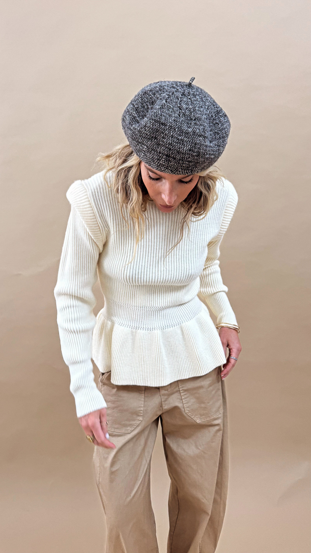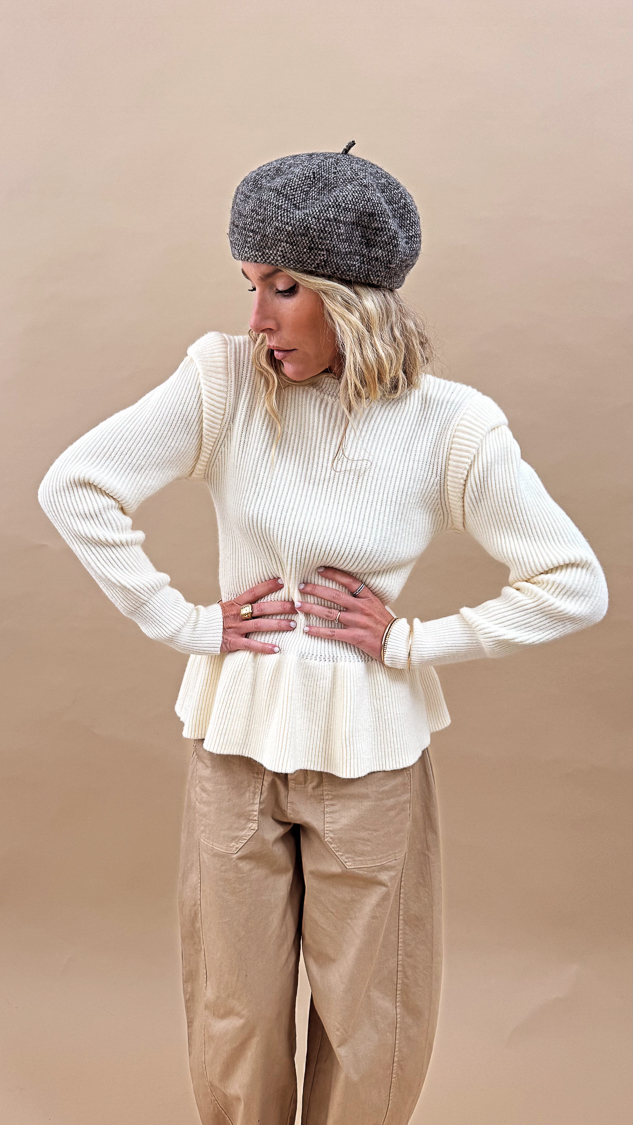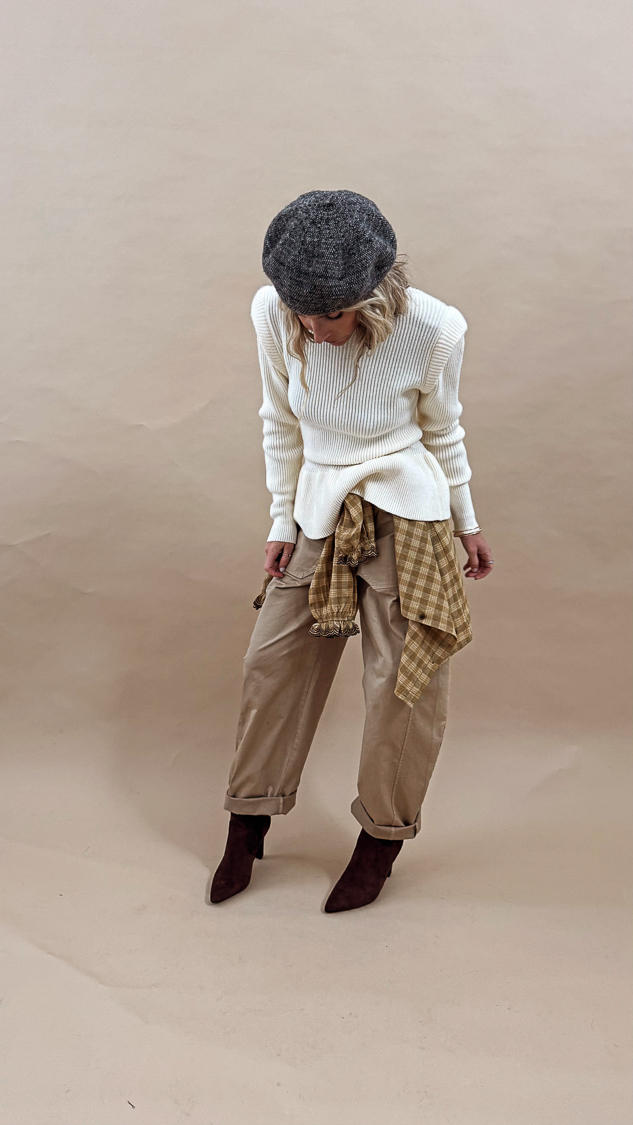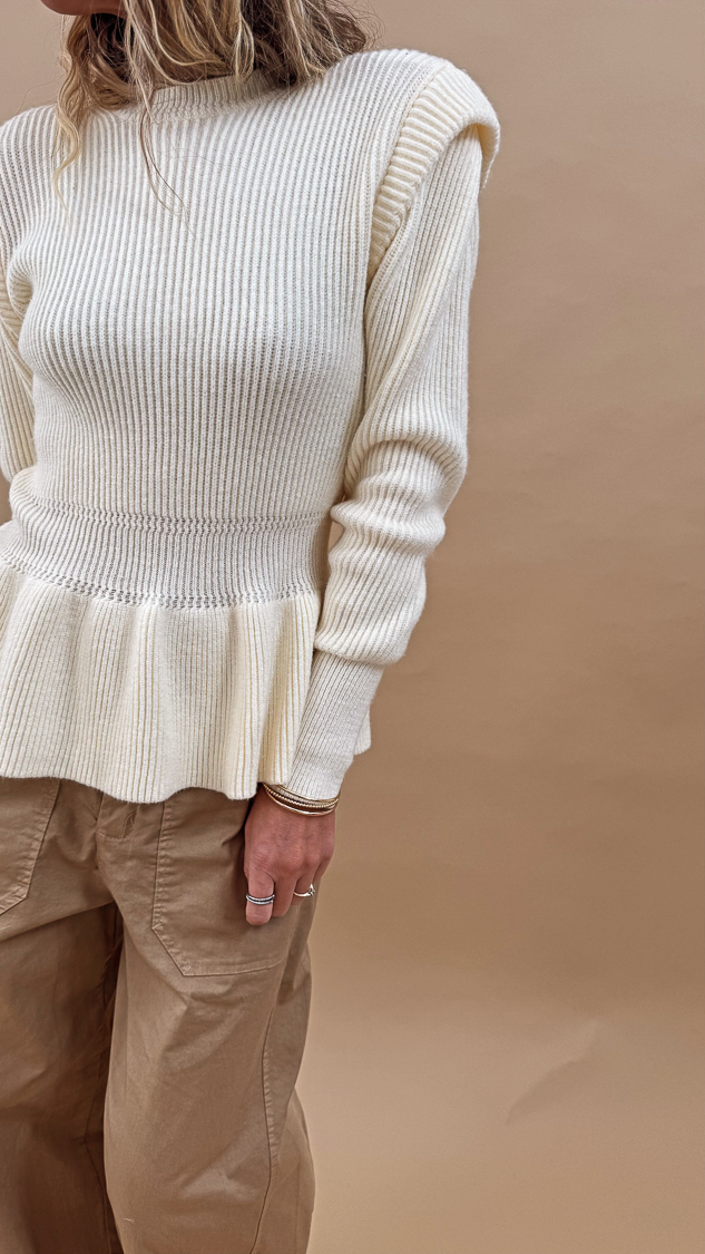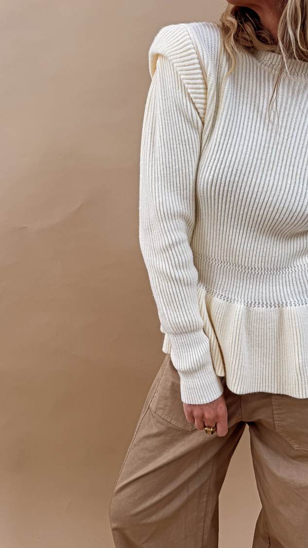 Le pull écru côtelé et volanté en bas, avec des épaulettes donne du style à vos tenues!