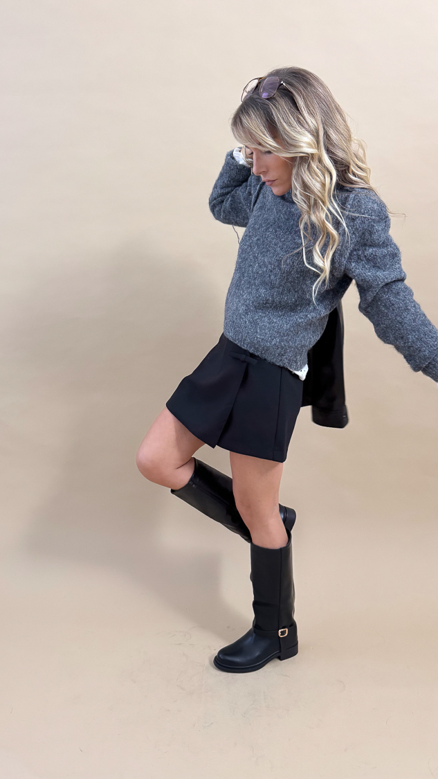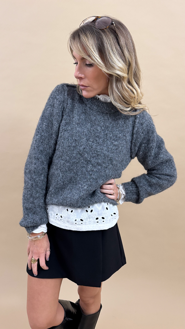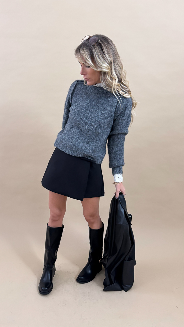 Le pull gris foncé en grosse maille, son col rond et son détail de couture épaisse aux épaules !