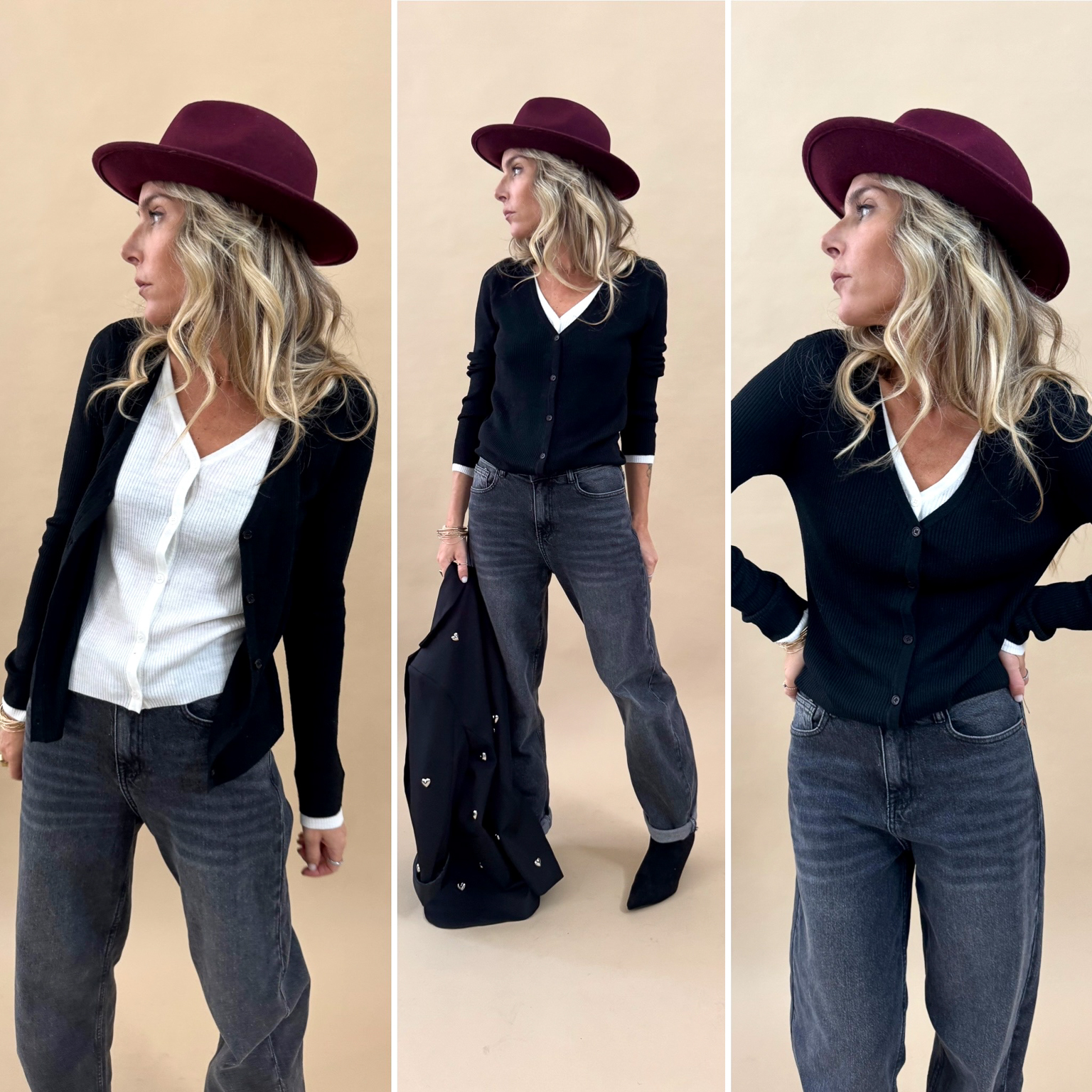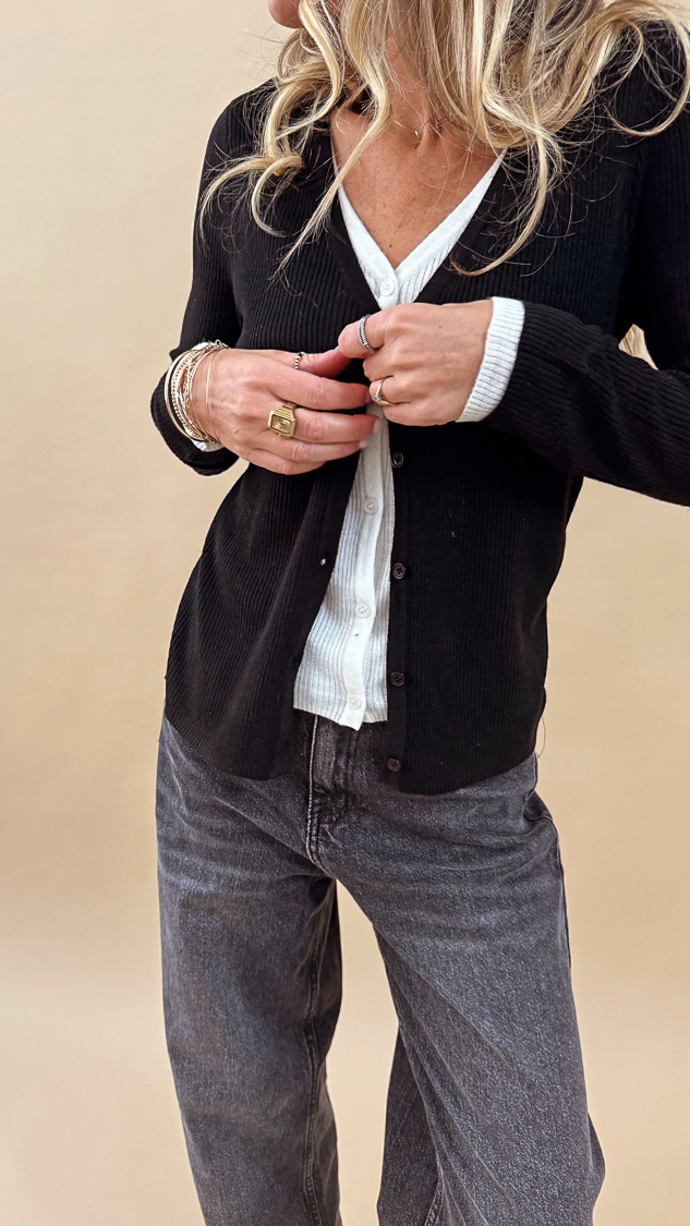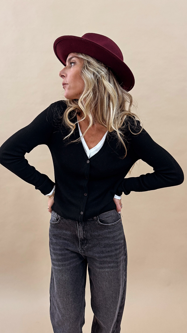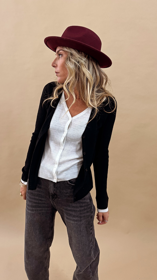 Le pull noir à doublure blanche sur le décolleté et les manches, sa maille douce et fine est parfaite pour la mi-saison et s’associera avec la jupe simili bordeaux ou noire!