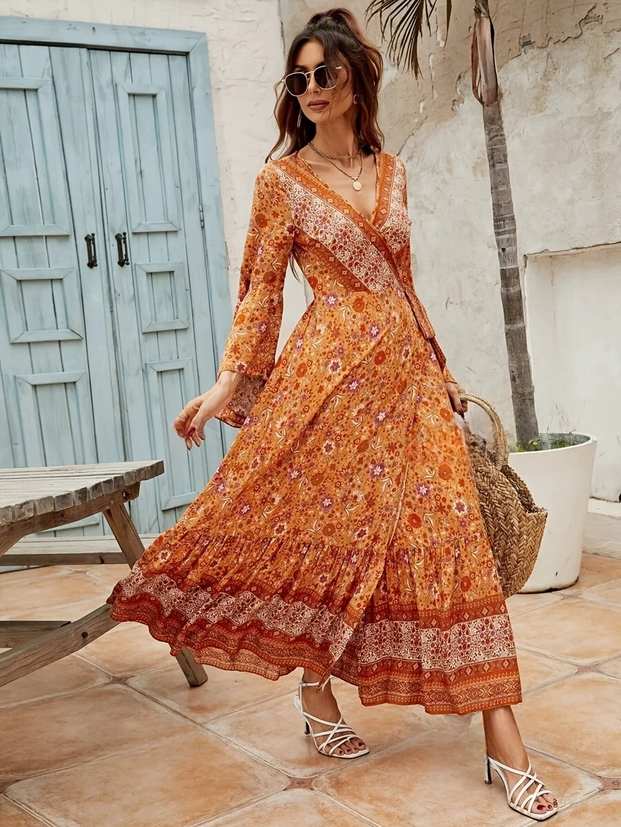 Apportez une touche de liberté et d’élégance à vos tenues avec cette robe bohème longue portefeuille, parfaite pour les beaux jours et les escapades estivales.