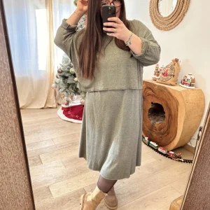 Le model porte habituellement une taille 46 et mesure 1m60. Elle porte la robe en taille. 46.