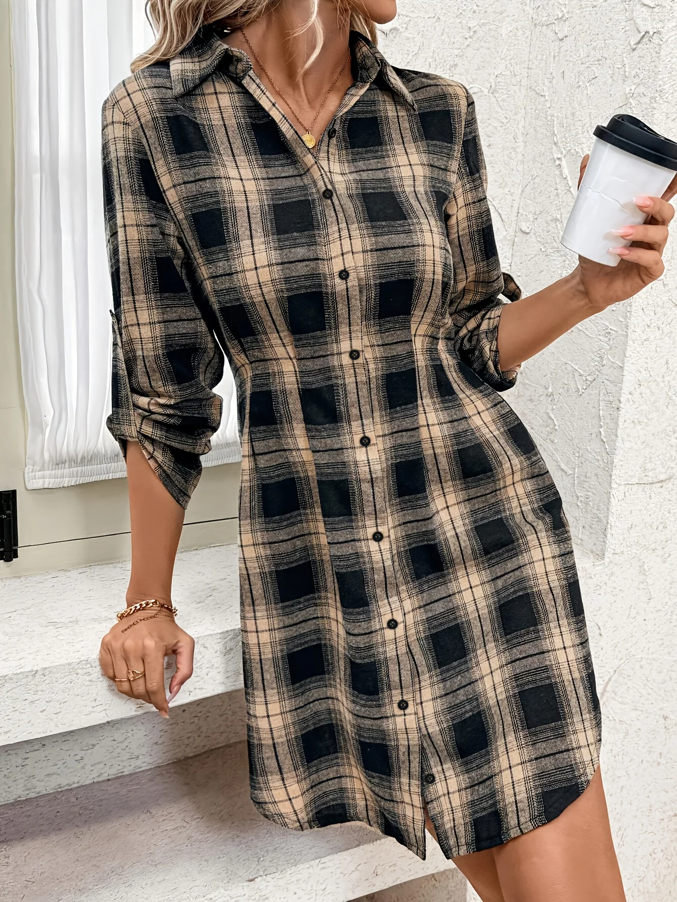 Robe chemise à carreaux femme en tissu flanelle doux, coupe évasée et manches retroussables, parfaite pour un style casual-chic toute la saison.