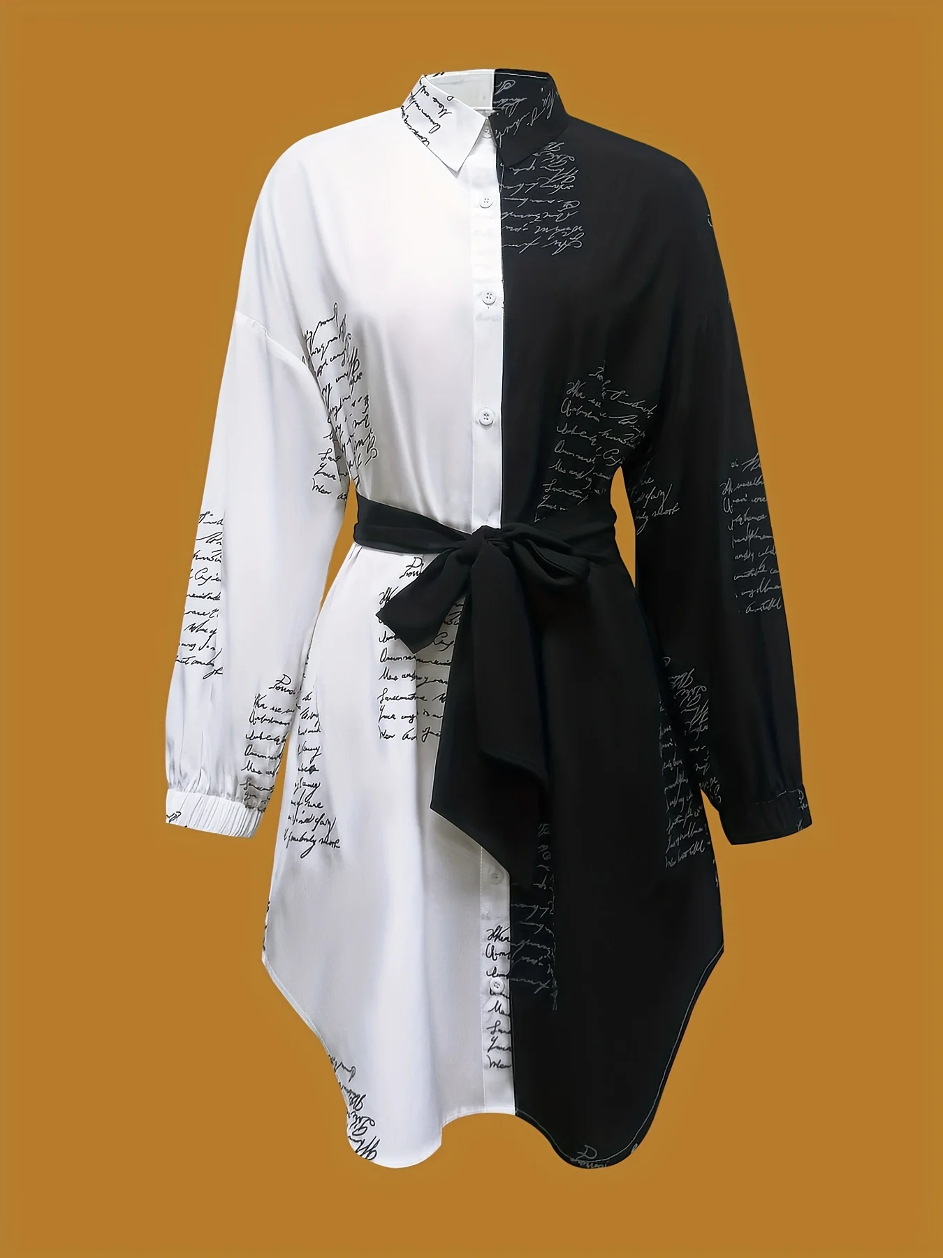 Laissez-vous séduire par la robe chemise imprimé bicolore femme, un modèle au style moderne avec sa coupe chemise et son jeu de contrastes noir et blanc, idéal pour une allure sophistiquée en toute simplicité.