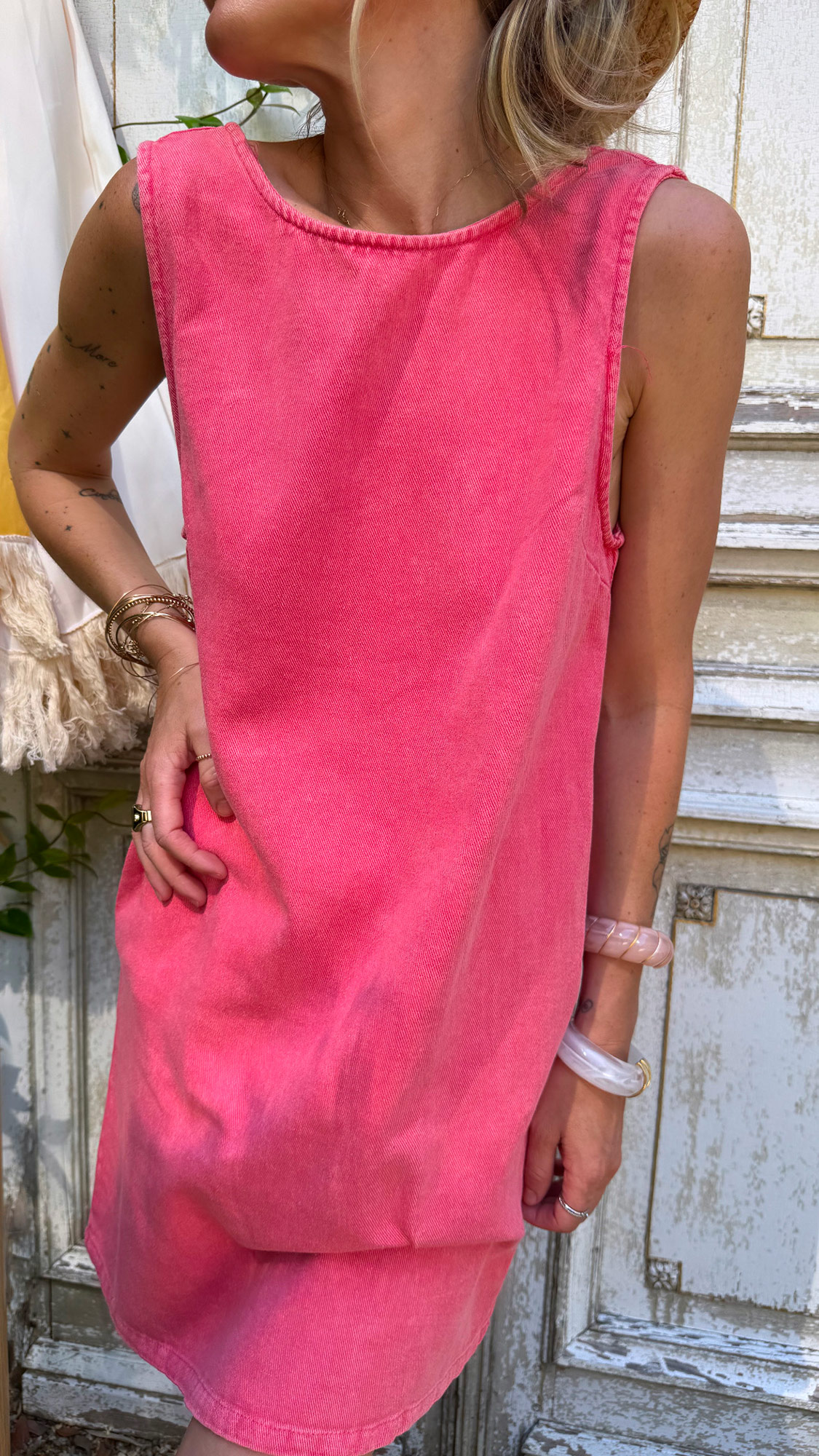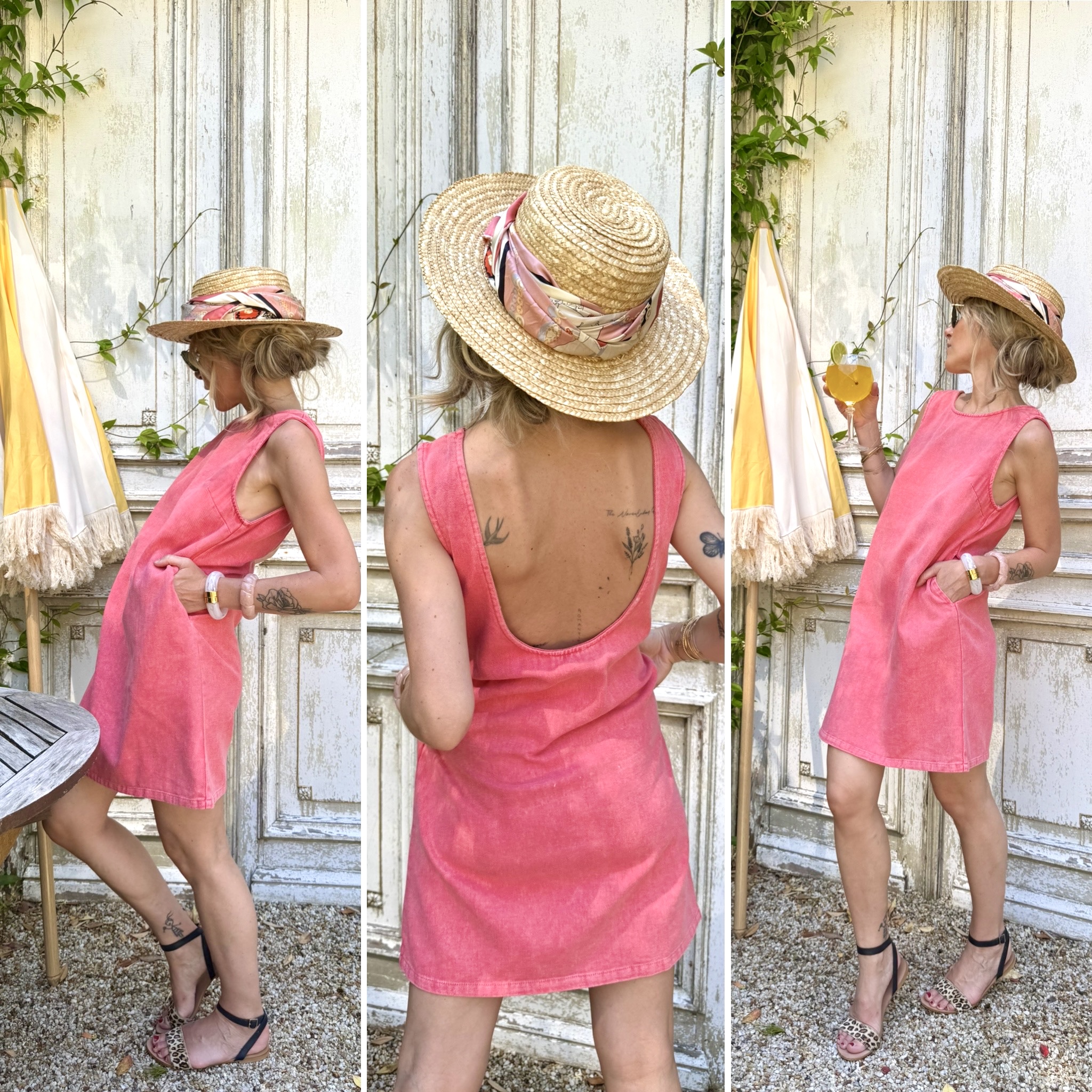 Originale et pleine de caractère, cette robe en jean se distingue par son dos couleur framboise délavé. Un contraste subtil et audacieux pour un look casual chic qui ne passe pas inaperçu. À porter sans modération !