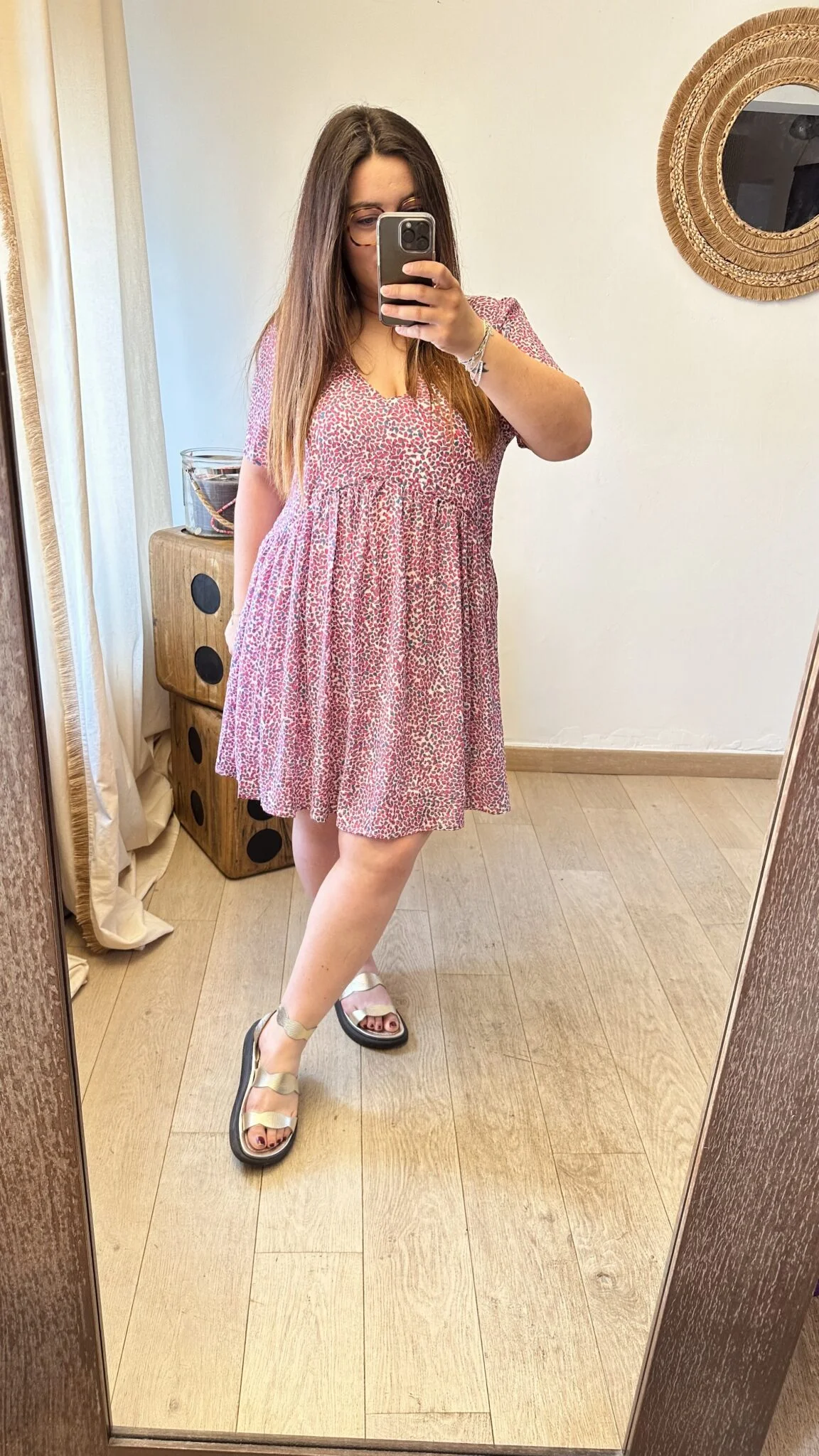 Robe courte motifs rose blanc et bleu. Coupe patineuse. Col V manches courte. La robe est doublée.