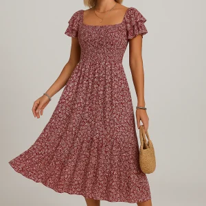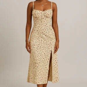 Découvrez la robe midi bustier fleurie femme, au décolleté corset et imprimé floral délicat, parfaite pour un look estival élégant et raffiné.
