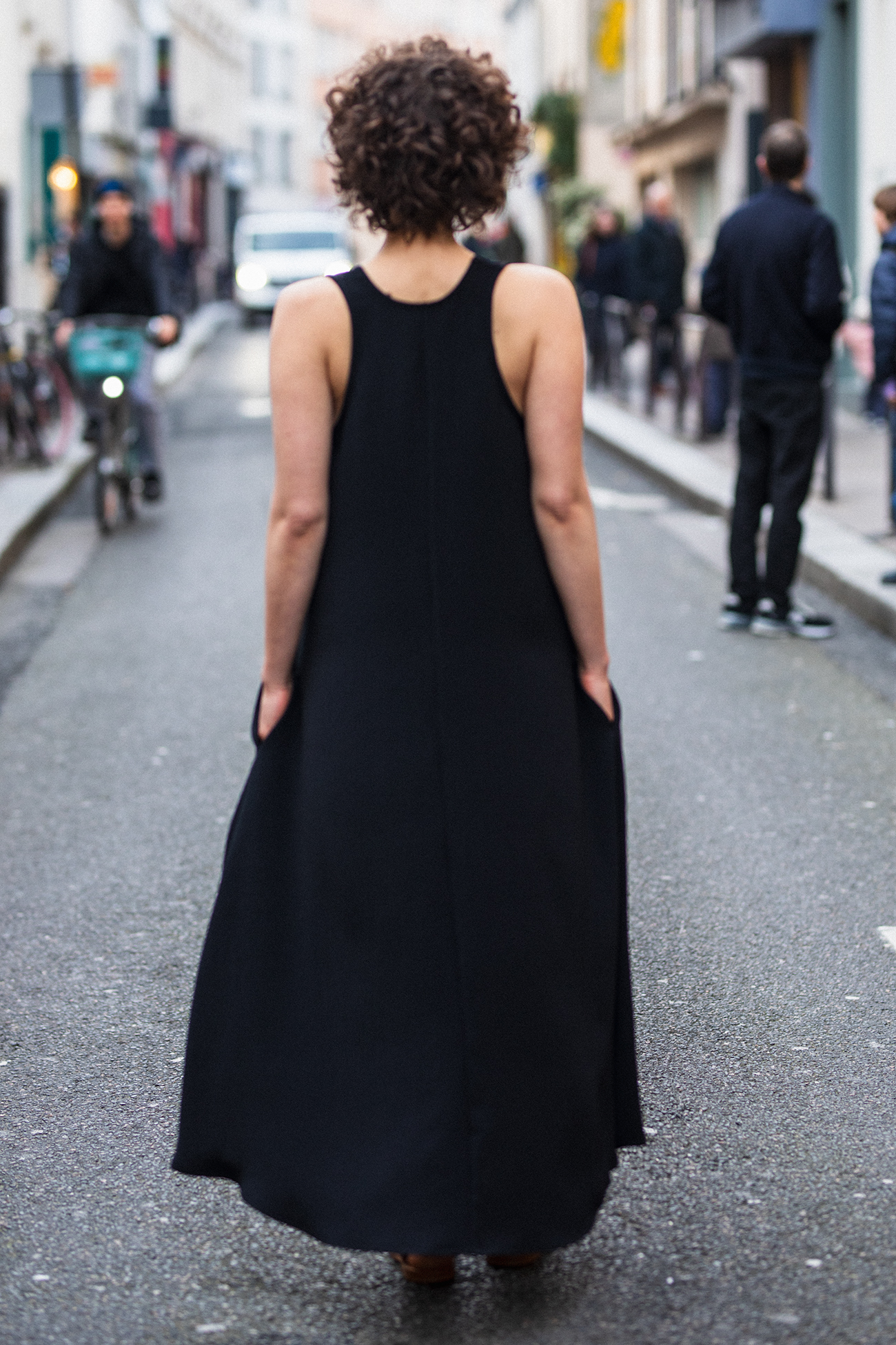 Mélanie porte la robe Island en T1. Elle mesure 1m71 et porte habituellement une taille 36/38.