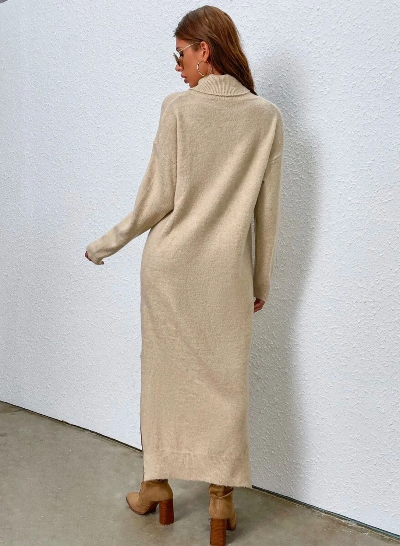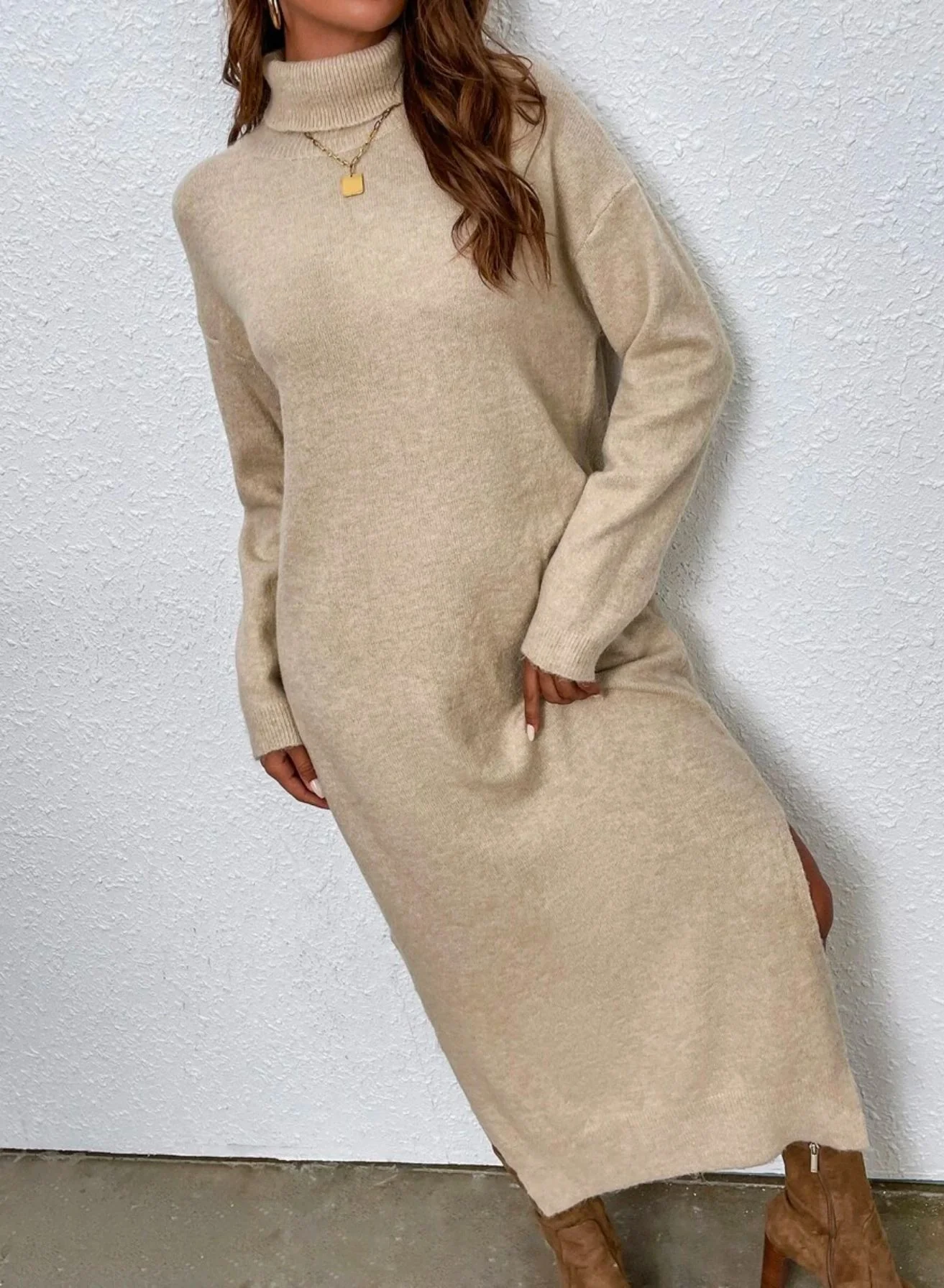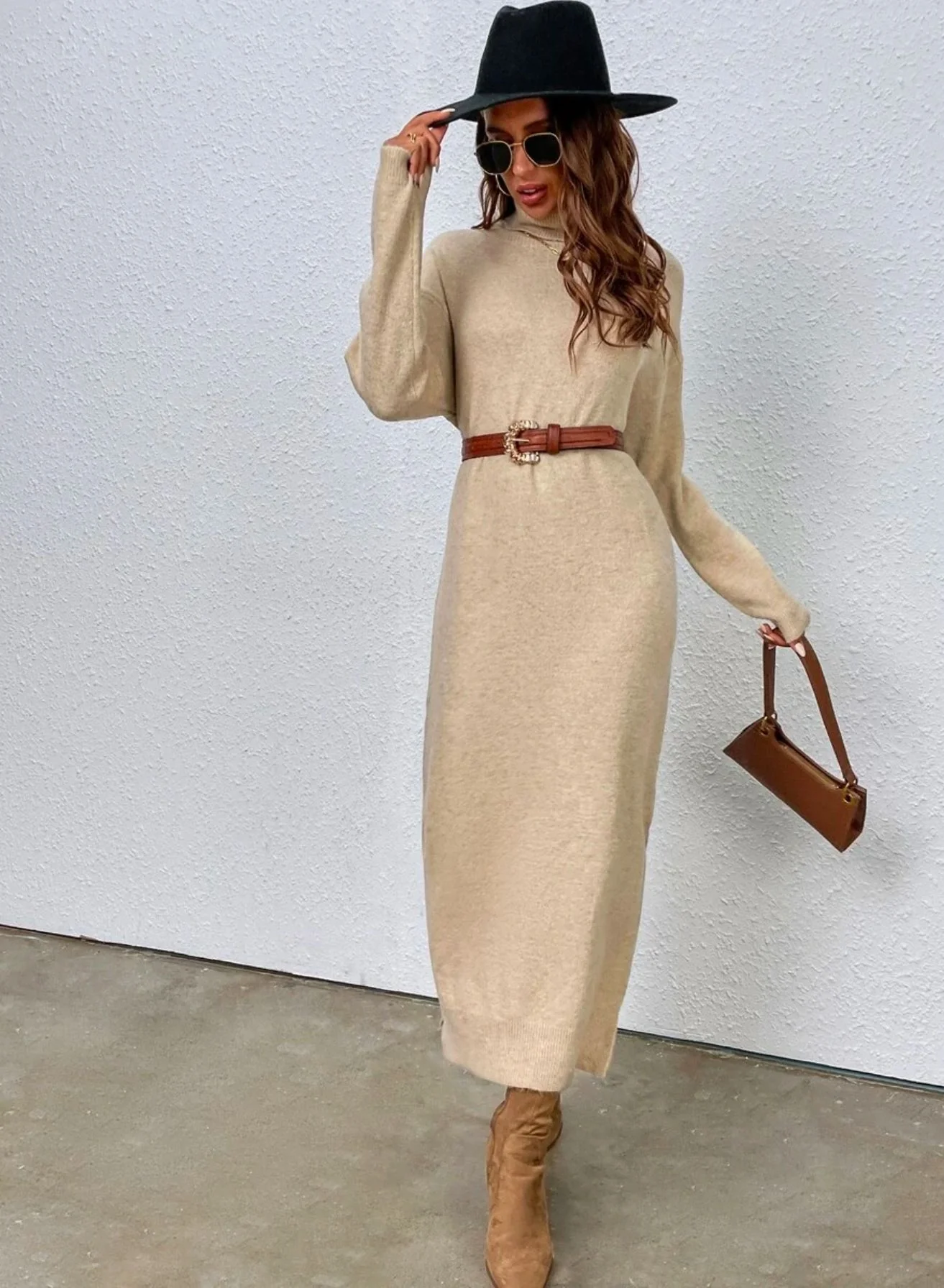 Affirmez votre élégance hivernale avec cette robe longue beige élégante et raffinée.