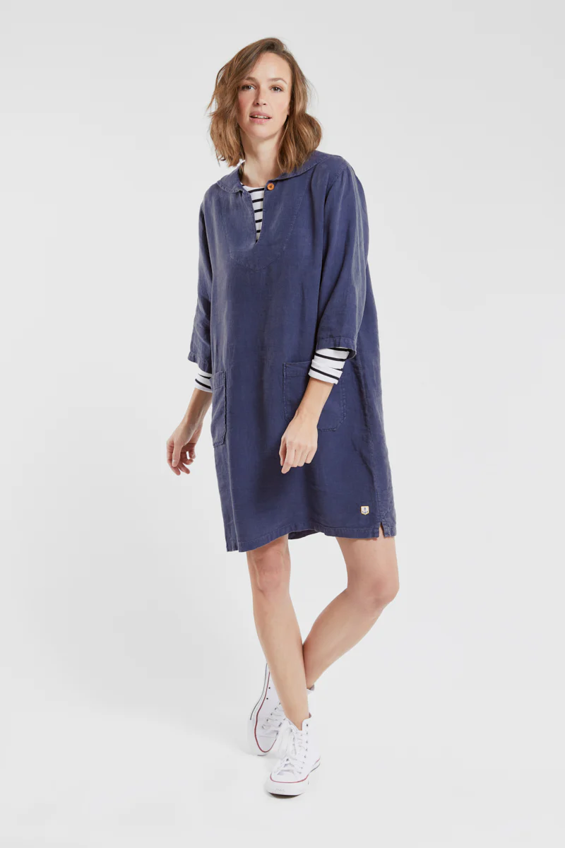 Craquez pour cette robe en lin, parfaite pour cet été. Vous allez adorer son esprit vareuse, pour un look marin!