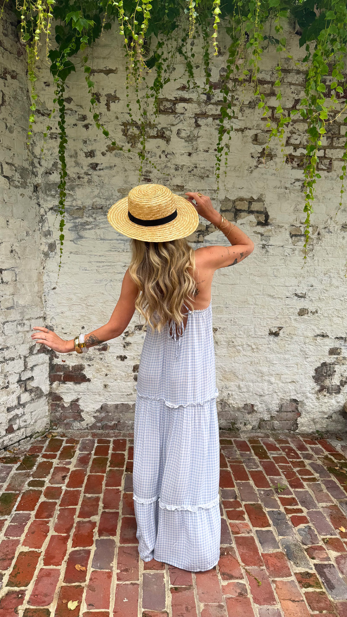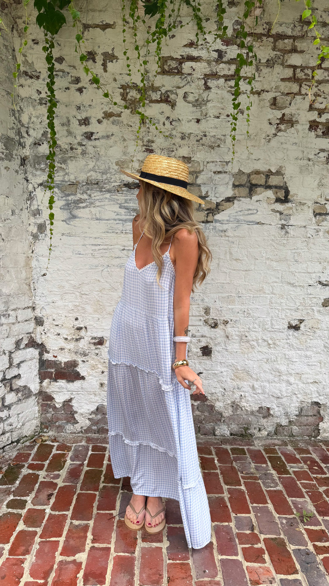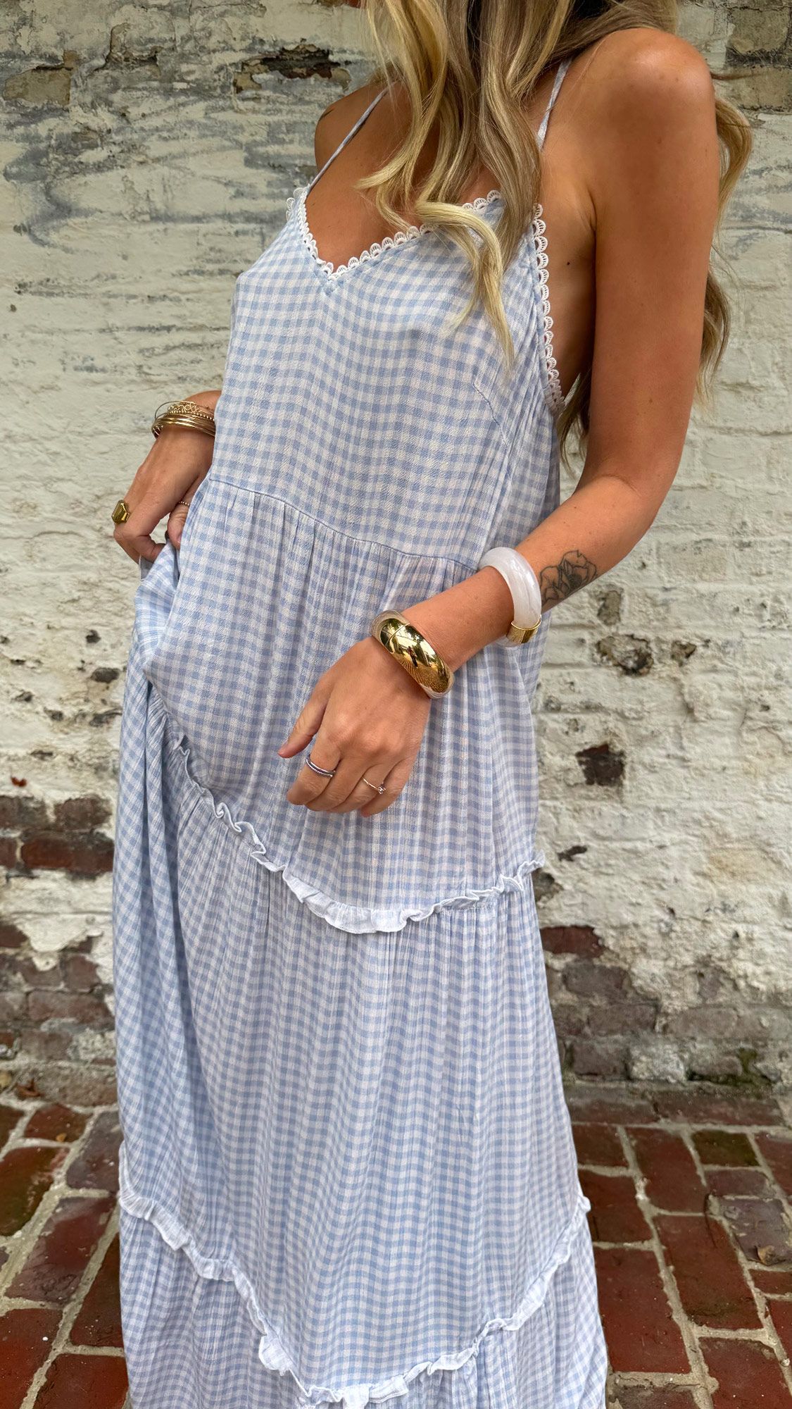 Légere, fraîche et fluide on craque sur la petite robe vichy bleu ciel avec ses subtiles dentelles blanches. Bretelles réglables