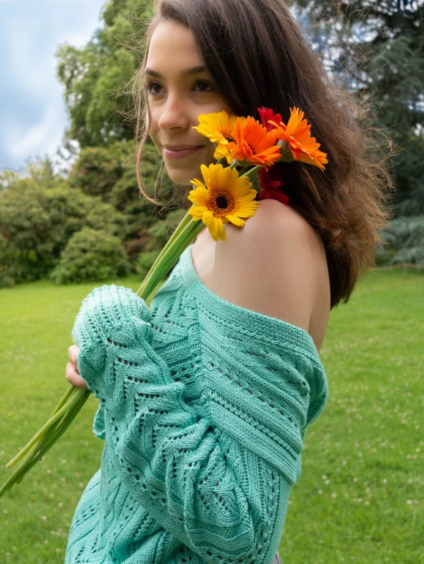 Il est en coton Cachemire, léger et doux pour l’été. Ce gilet est un mélange de plusieurs points ajourés.