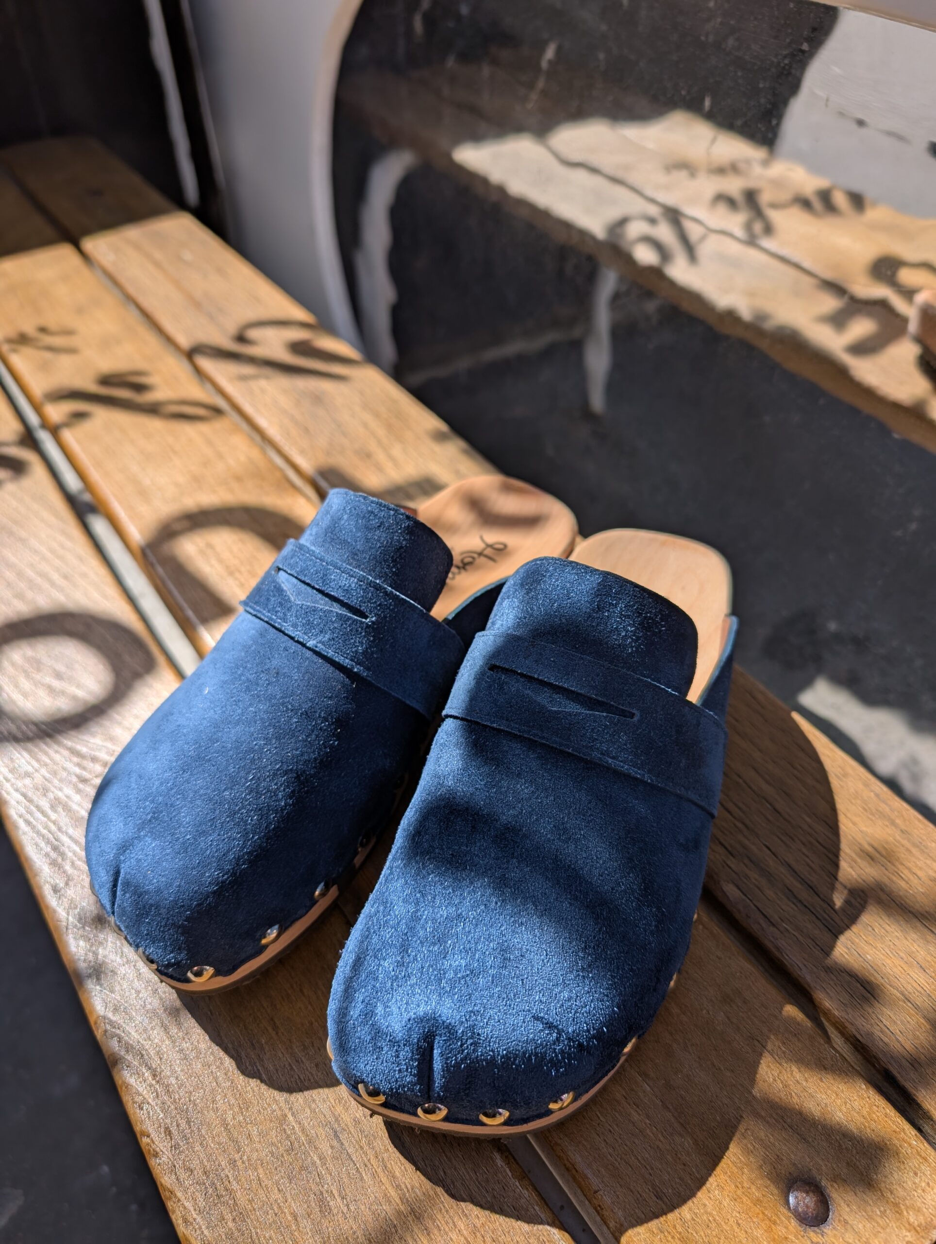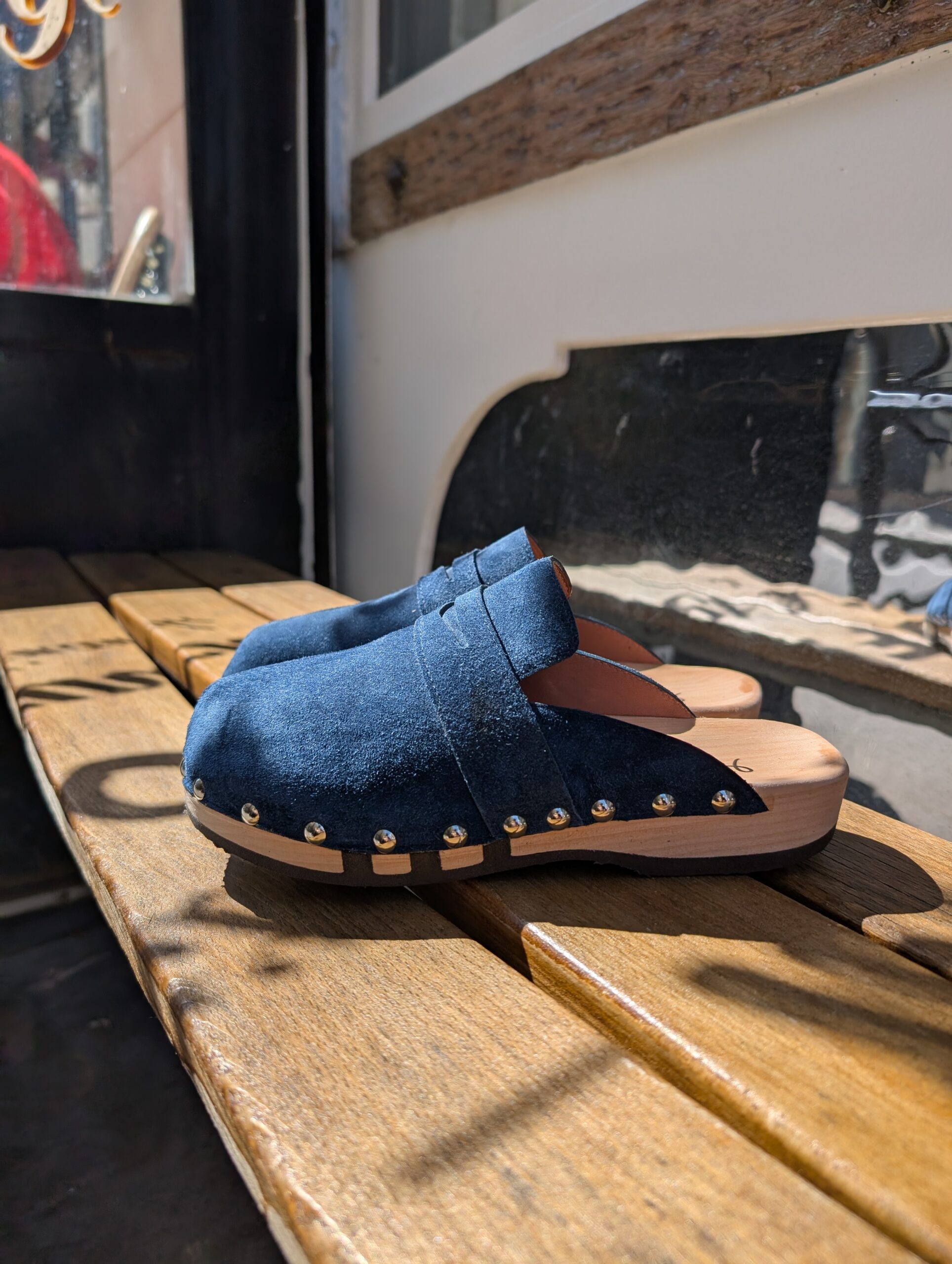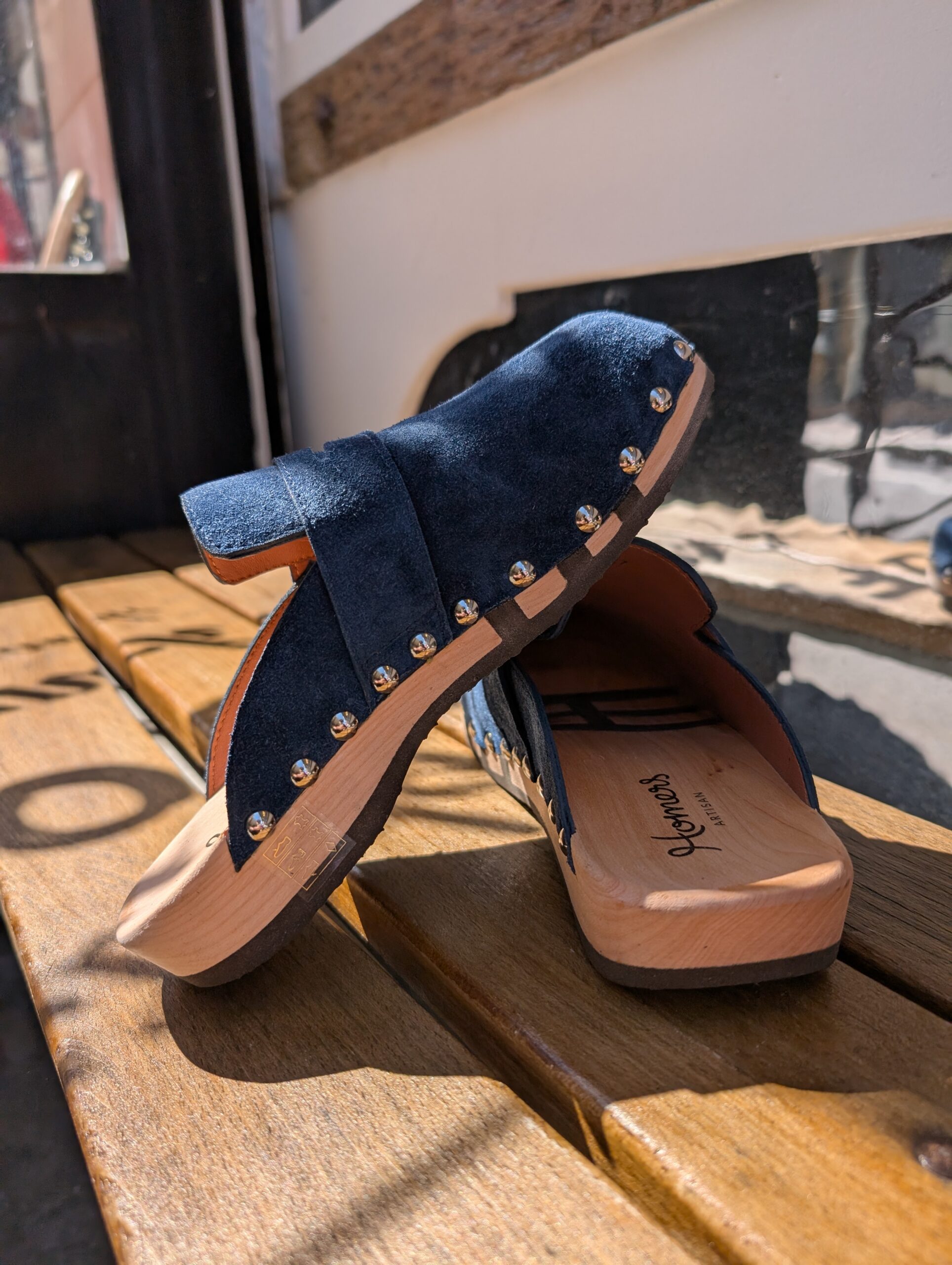 Cuir extérieur souple, semelle en bois, avec trois lignes de caoutchouc pour permettre une grande souplesse du sabot.
