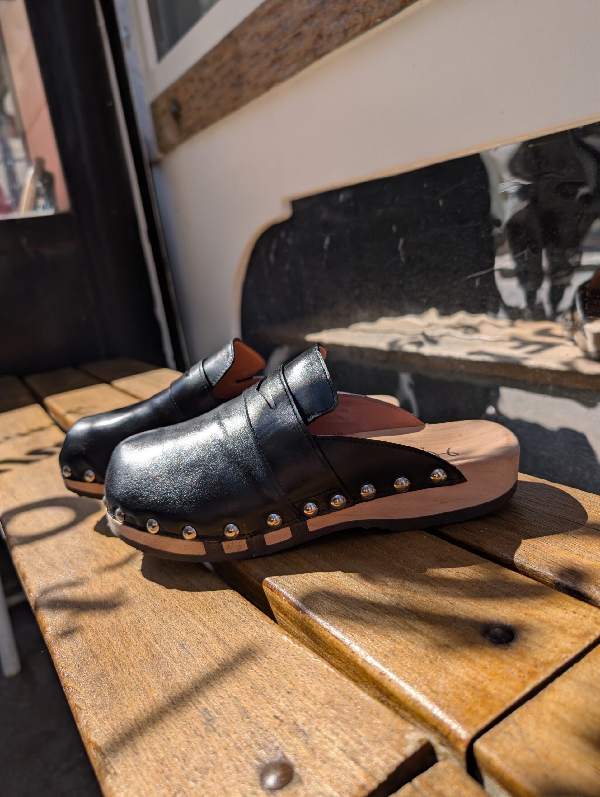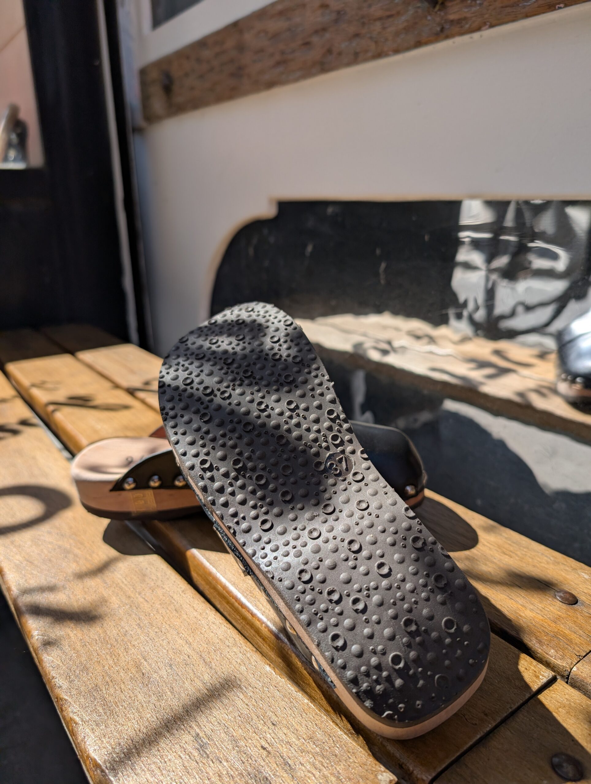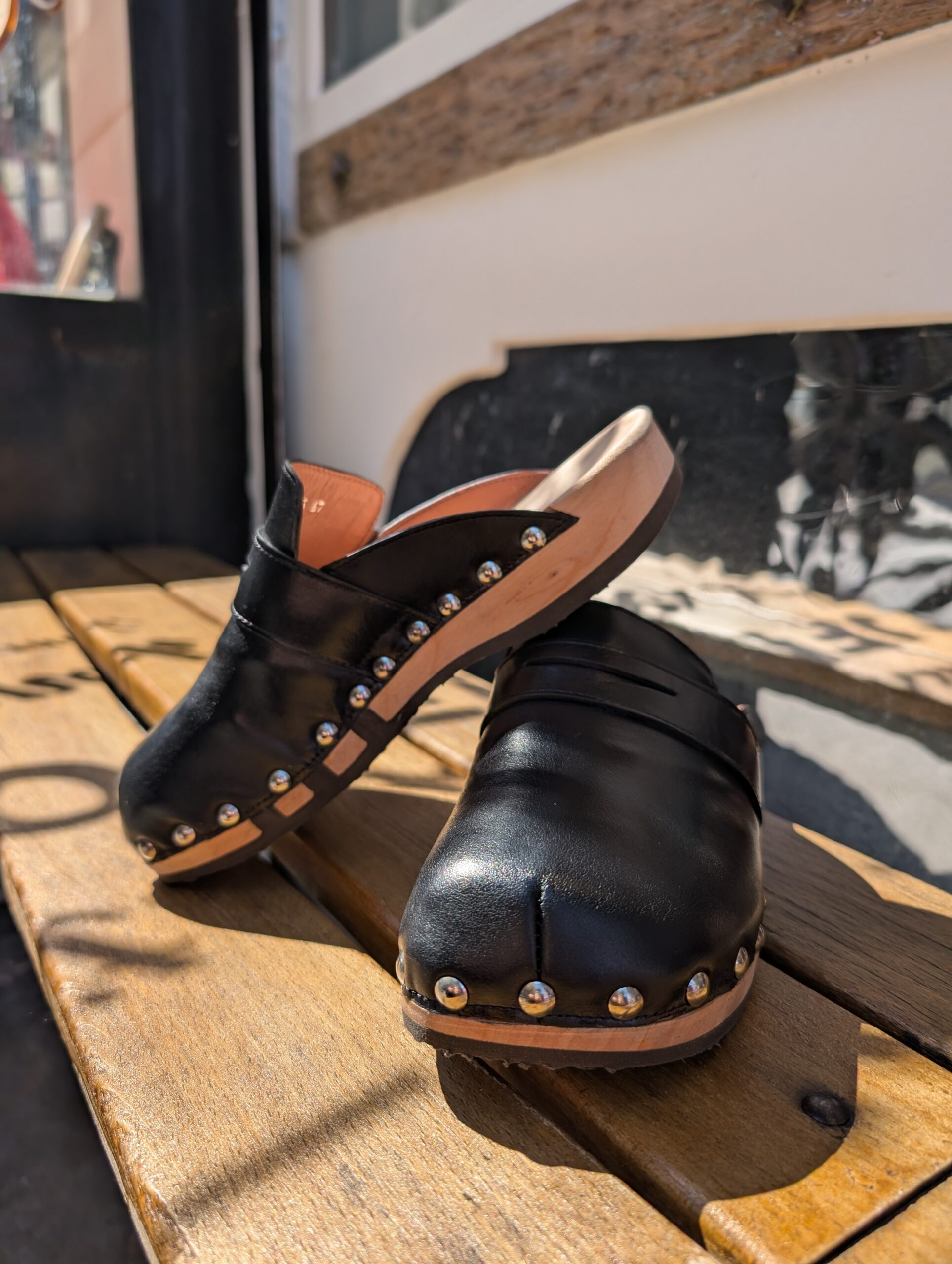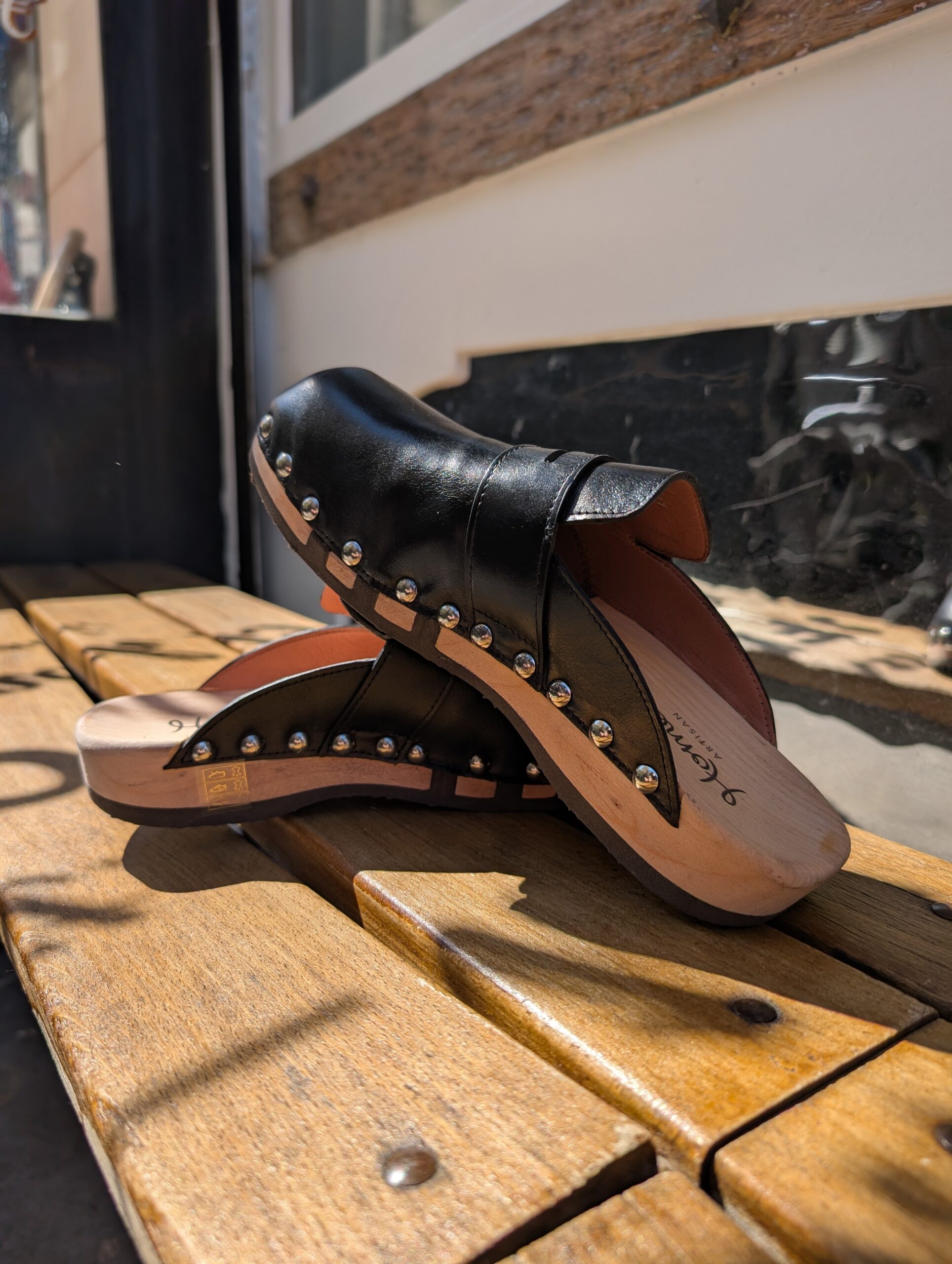 Cuir extérieur souple, semelle en bois, avec trois lignes de caoutchouc pour permettre une grande souplesse du sabot.