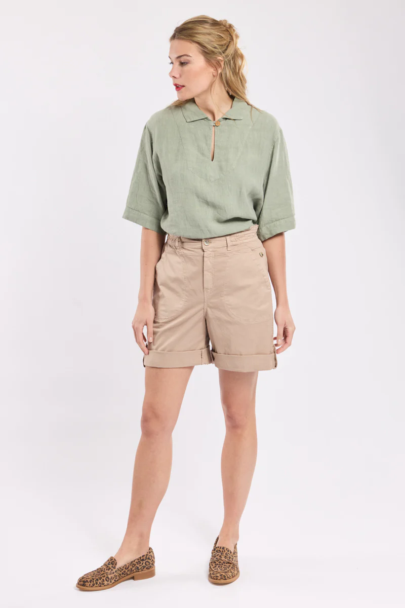 Optez pour Elio, notre short retroussable! Il a sa taille élastique et un effet volanté au dessus de la ceinture, le bas est retroussable avec des pattes boutonnées. Elio a deux poches devant et au dos.