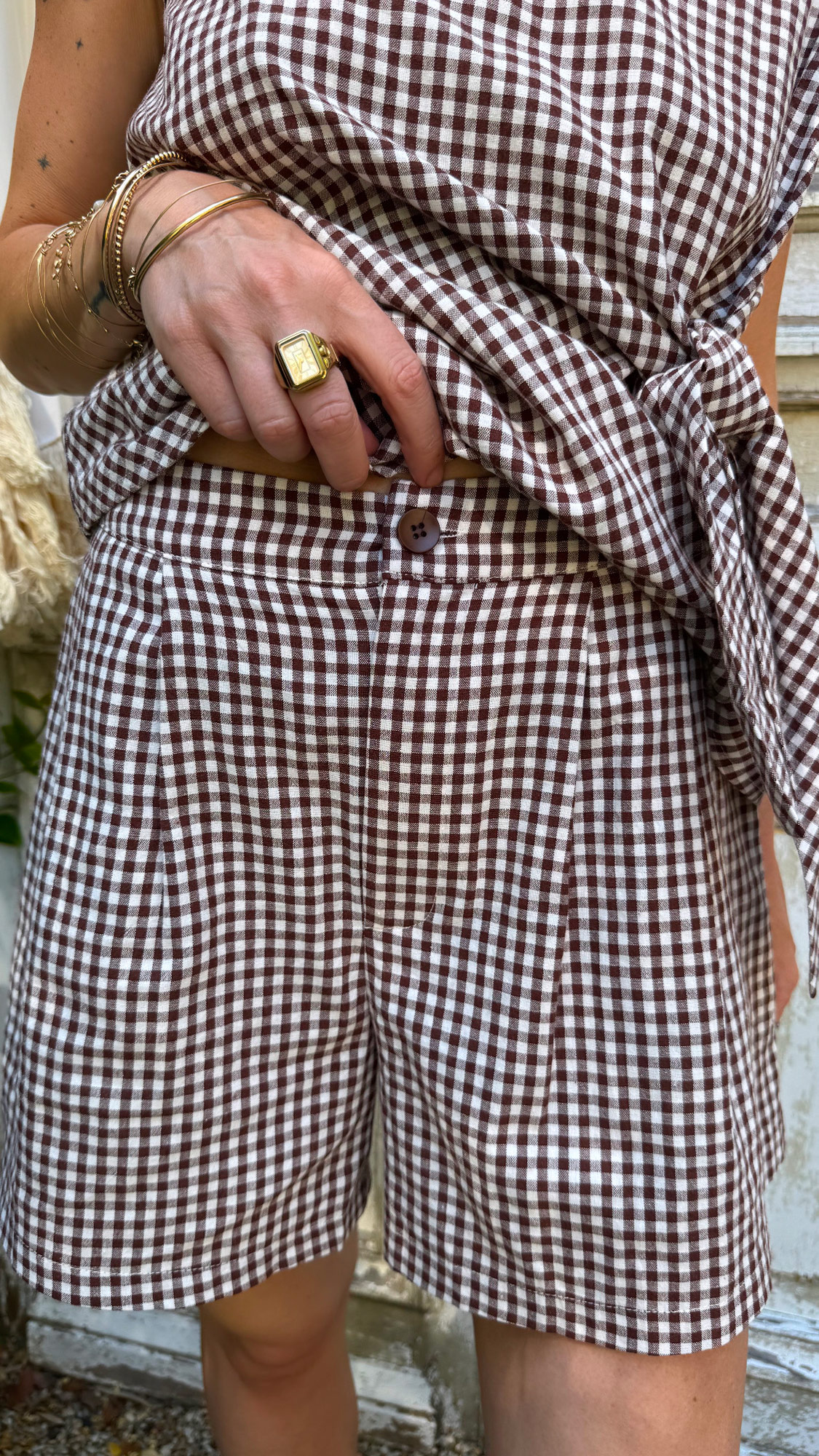 Craquant et facile à porter, ce petit short vichy marron et blanc mise sur le charme rétro. à associer au top pour un look estival frais et stylé !