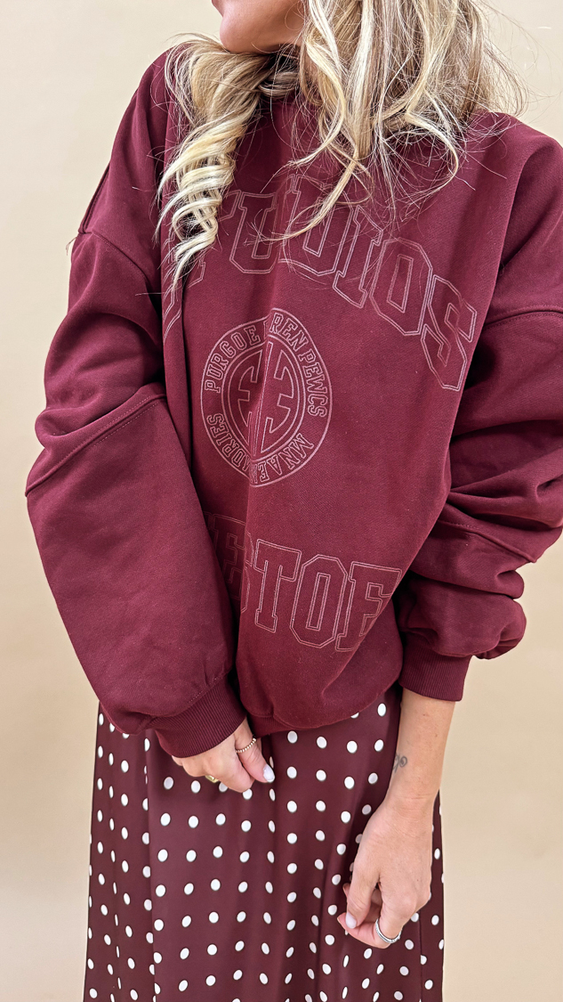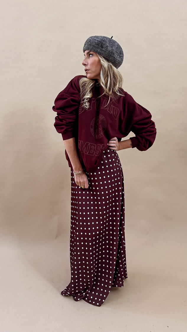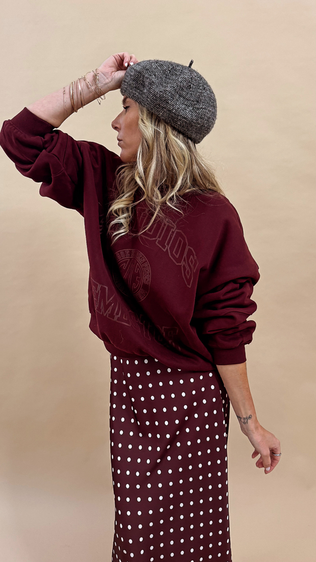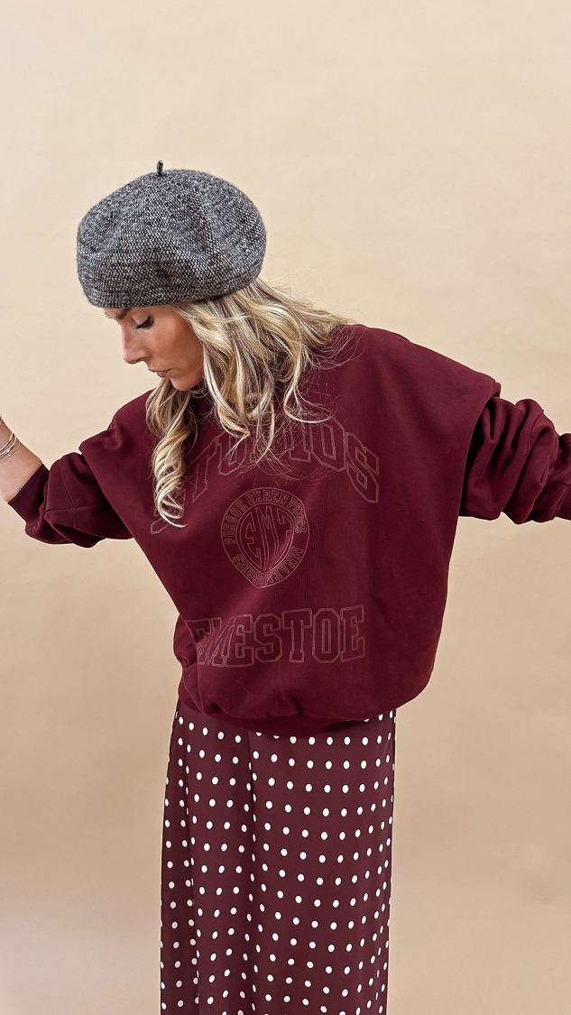Le sweat bordeaux STUDIO légèrement oversize pour un look casual à associer avec notre jupe longue simili ou notre jean gris!