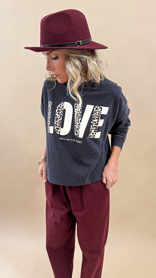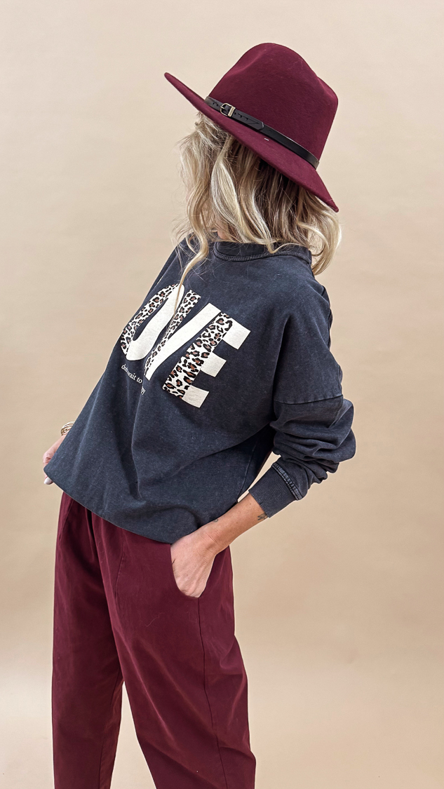 Le sweat gris LOVE léopard et sa coupe légèrement oversize, parfait en association avec notre jupe similicuir pour un look chic et décontracté !