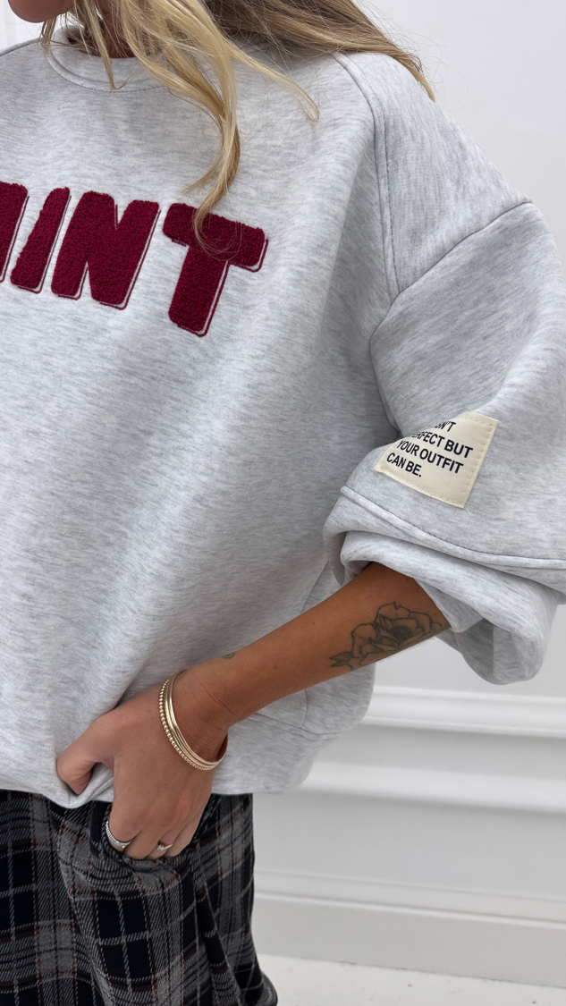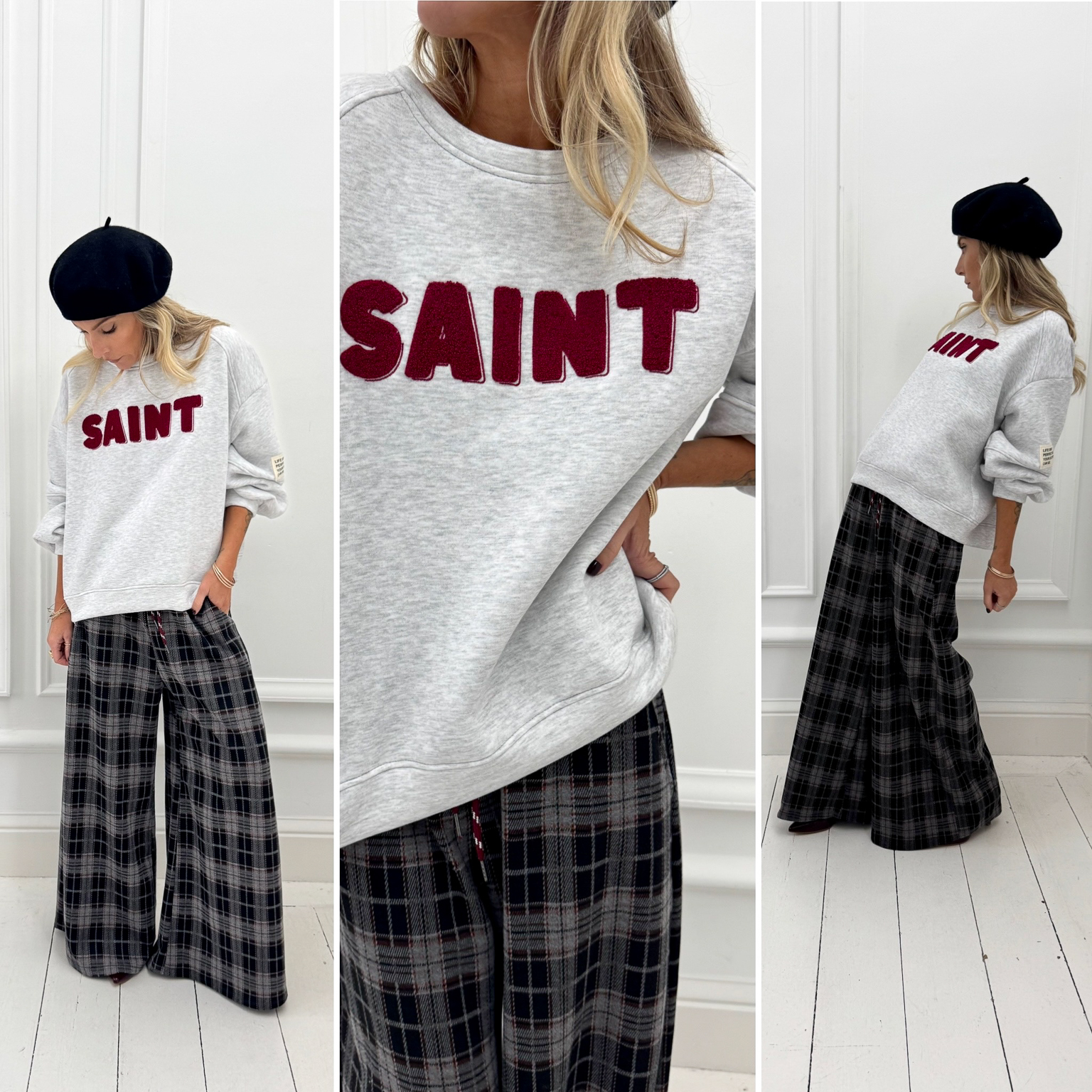 Ce sweat épais et chaud affiche une inscription “SAINT” en relief bordeaux sur le devant, une étiquette avec une phrase en anglais sur la manche gauche, et une couture apparente au centre de la manche. Il se marie parfaitement avec notre pantalon en similicuir bordeaux pour un look affirmé et tendance.