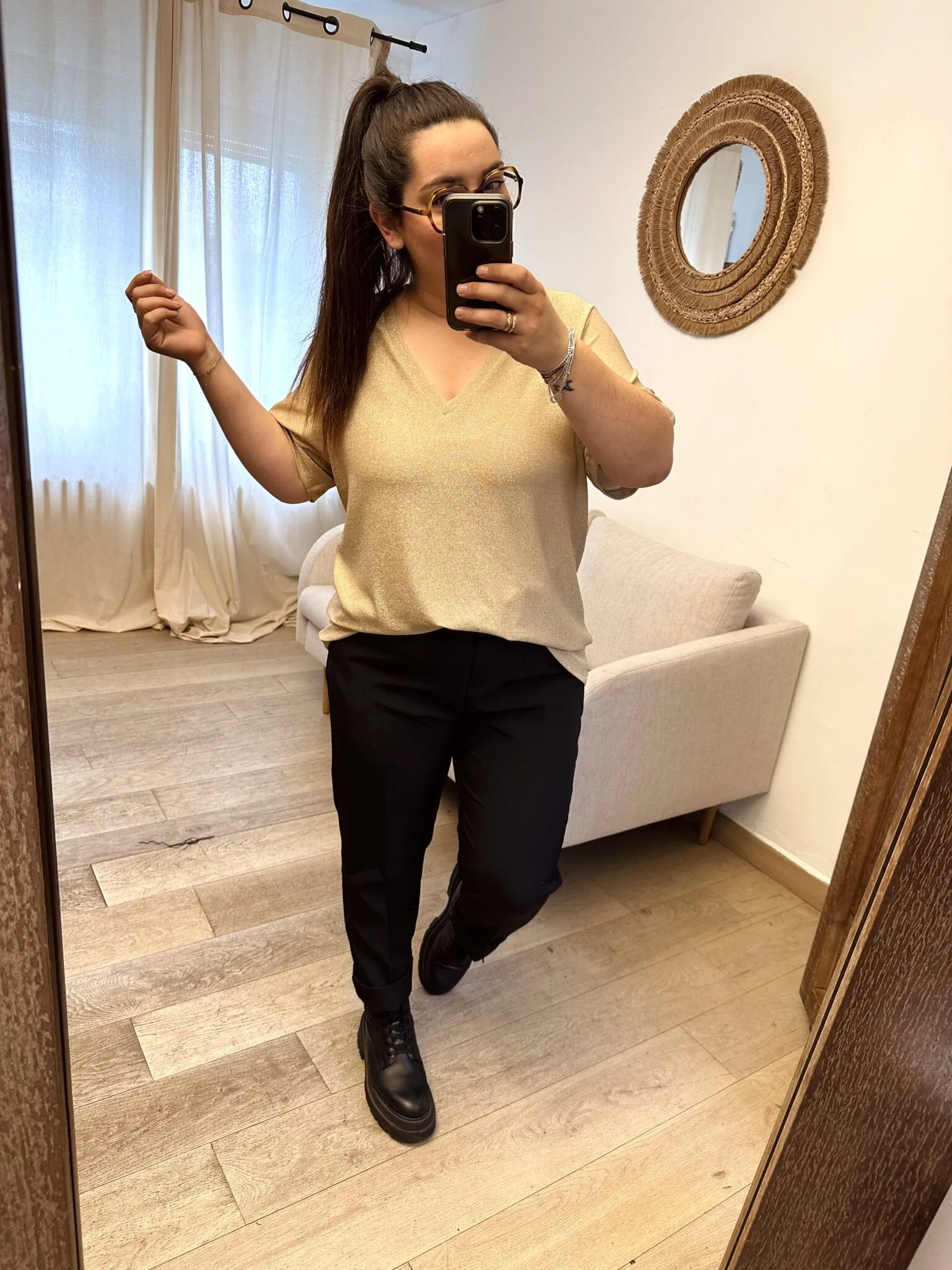 Le model porte habituellement une taille 44 et mesure 1m60. Elle porte le taille 44/46 pour le t shirt gold.