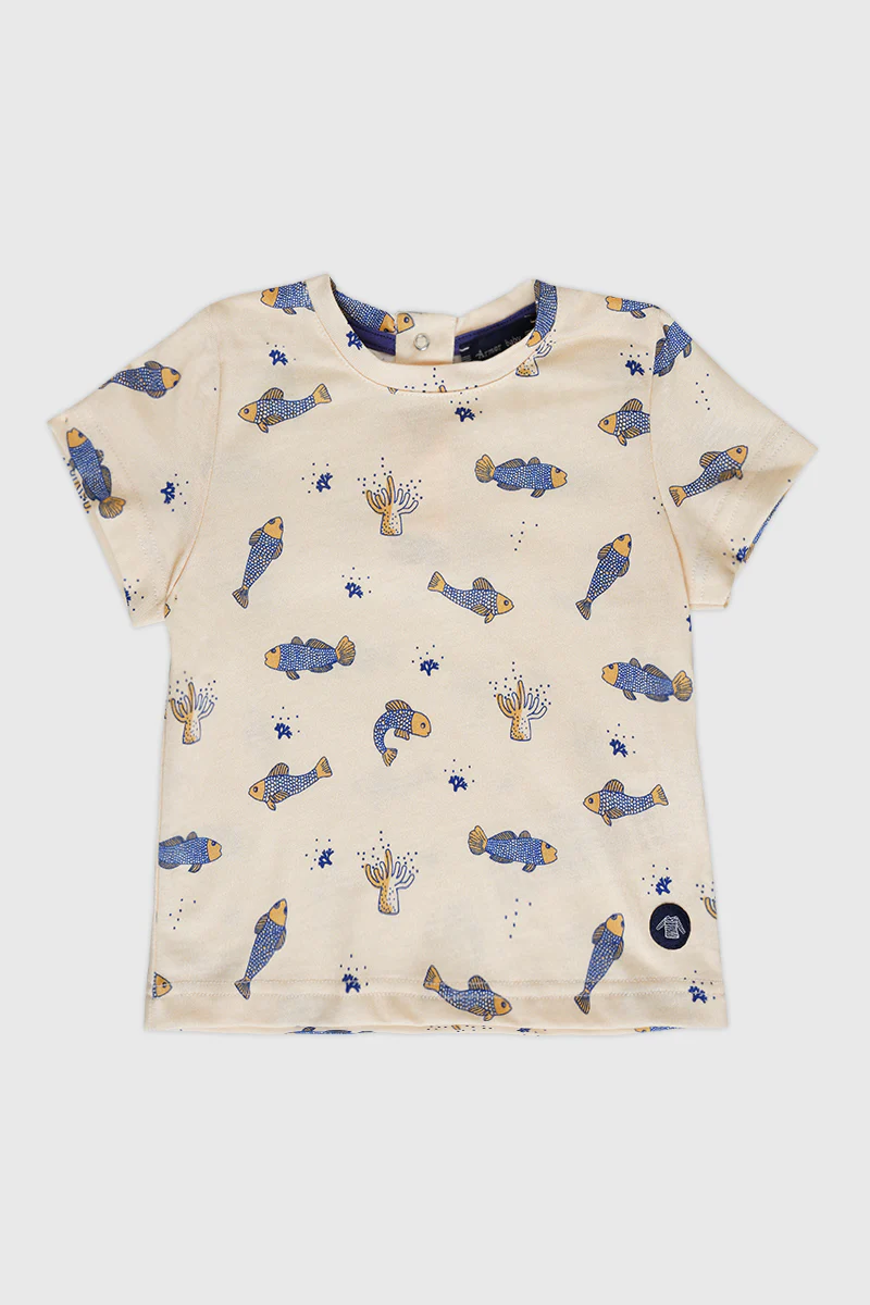 On adore la sérigraphie colorée de ce t-shirt en coton léger avec un petit poisson en train de nager entouré d’anémones et de coraux.